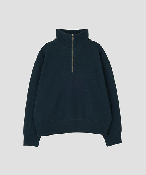 ダブルフェイスで編み立てたコットンジャージーで仕立てたハーフジップジャンパー。Tシャツより厚みがあり、裏毛より軽やかな質感が特長。細かなリブのような組織感で、ニットのような着心地を楽しめる素材。