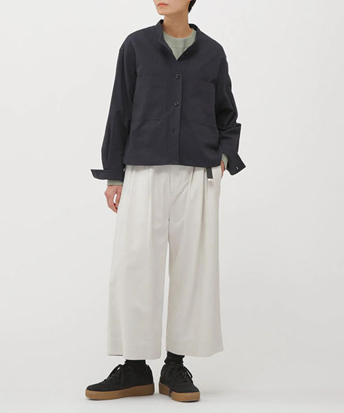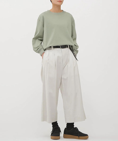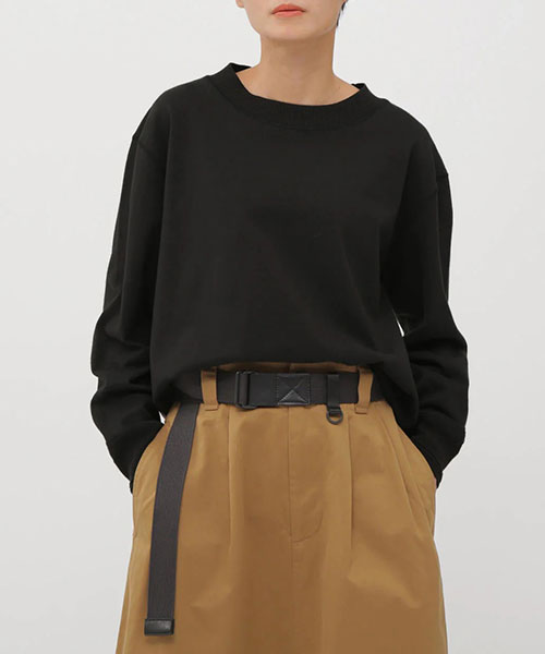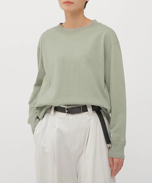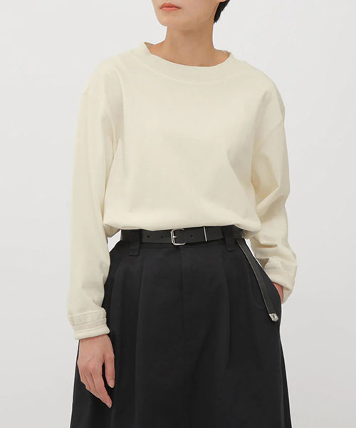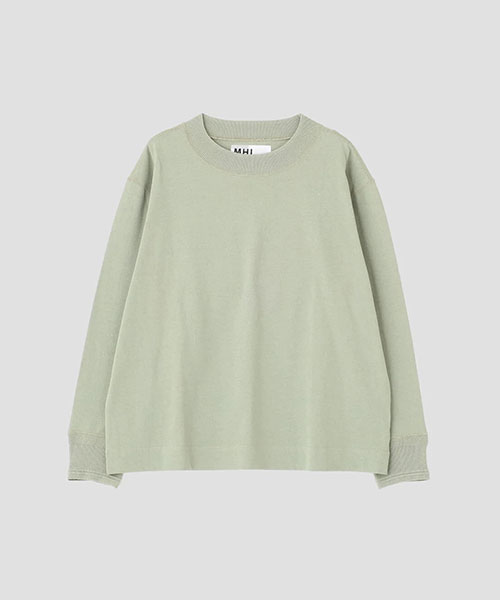 膨らみとドライな質感をあわせ持つ太番手の空紡糸を使い、コットンの繊維を残して編み立てたジャージー素材のTシャツ。さりげない陰影が出て、あたたかみのある風合いが特長。ゆるやかに編むことで、ウールのようなタッチとコットンならではの快適さを兼ね備えたアイテム。襟と袖口は同じ糸で切り替え、袖口のタックをさりげないアクセントにしたデザイン。全体をカバーステッチで仕立て、サーマルTシャツを思わせる一枚。※こちらはMHL.SHOP・オンラインショップ限定の商品です。