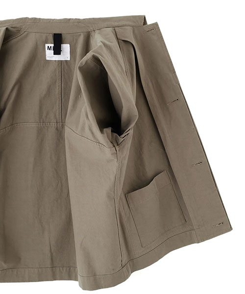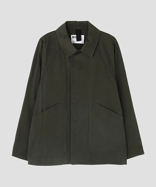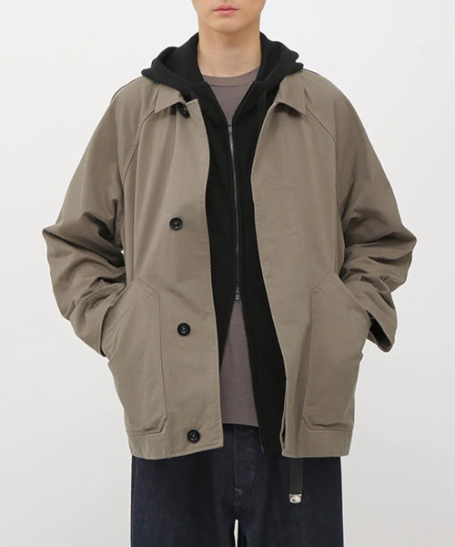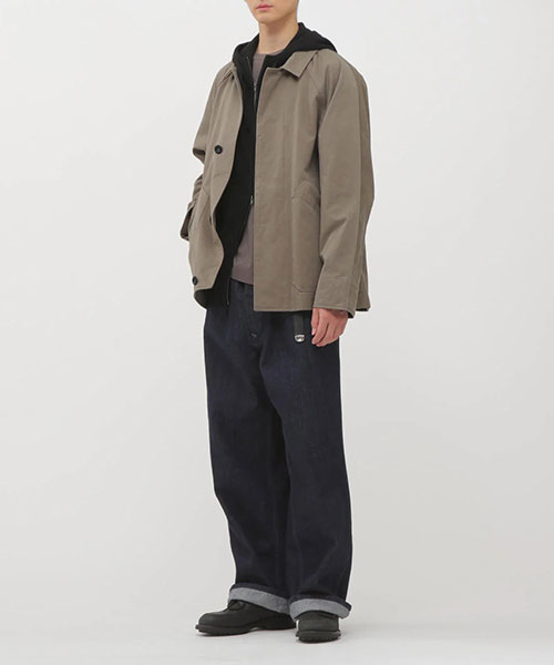 ヴィンテージのファクトリージャケットから着想を得たデザインで、前身頃はラグラン、後身頃はキモノスリーブに切り替えた独自のカッティングがポイント。腰ポケットを斜めに配し、デザイン性と実用性を兼ね備えた仕上がり。