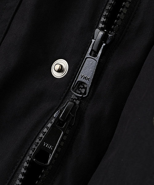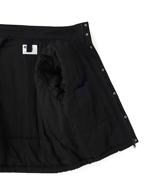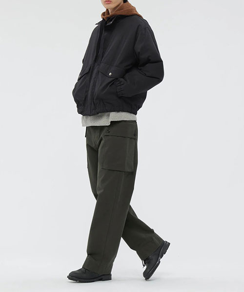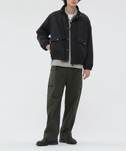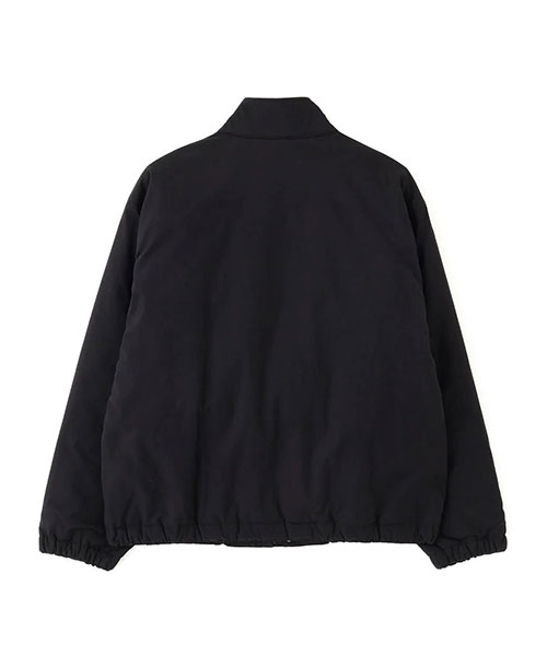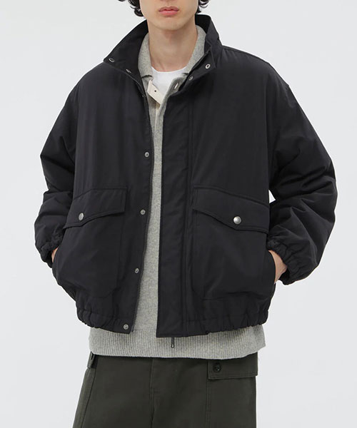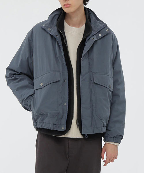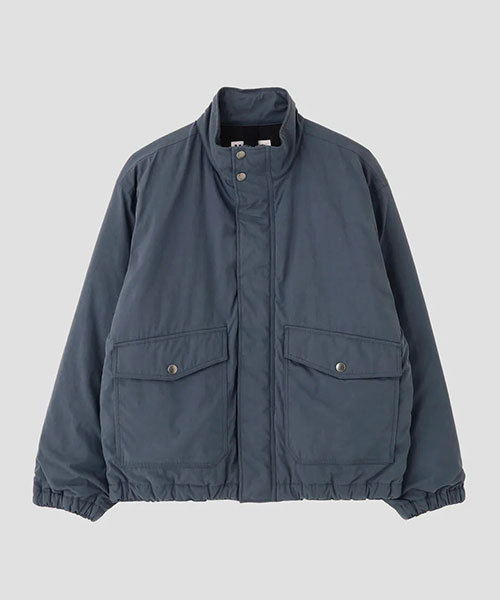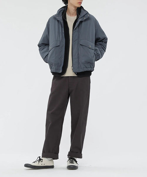 オーガニックコットンとリサイクルナイロンを組み合わせたキャンバス素材のブルゾン。微起毛を施し、軽さとウォーム感を加えたヴィンテージライクな味わいが特長。ゆったりとした身幅とスタンドカラーが新鮮な、中綿入りの軽く暖かな着心地。2方向から使える腰ポケットや、袖口と裾のゴムギャザーにドットボタンを合わせたディテールがスポーティな印象。ビスロン仕様の逆開ファスナーを採用し、幅広いスタイリングに対応する一着。
