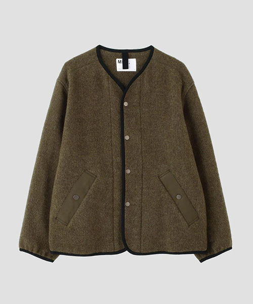 ミリタリーのライナーをイメージしたデザイン。全体をパイピングで仕上げ、軽さに拘った。フロントのドットボタンや、別布を用いた箱ポケットの口布など、ディテールにキャラクターを持たせた一着。ゆとりのあるボクシーフィットで、アウターとしても着映えるバランスの一着。