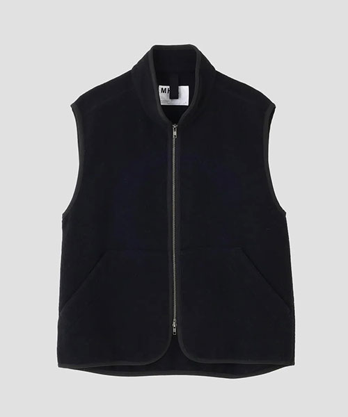 尾州で織り上げたメリノウールを使用したフリース素材のベスト。二重織りに両面起毛を施し、肌に触れる部分はすべてウールとなる贅沢な仕立て。スーツ地で用いられる梳毛をあえて取り入れ、柔らかくしなやかな風合いが特長。ミリタリーライナーをベースにアレンジし、パイピングで軽やかさを出した仕上げ。スタンドカラーのカッティングと大きなカンガルーポケットを組み合わせたデザインで、フロントはジップ仕様にすることでレイヤードのしやすさを備えた一着。