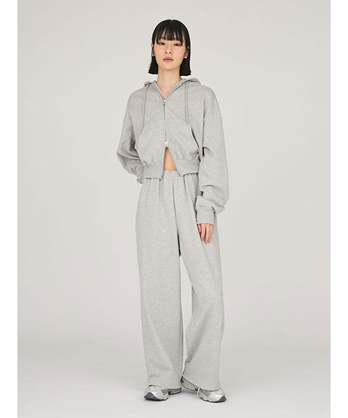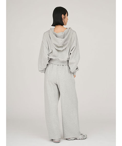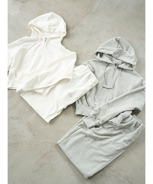 フーディは短丈で、身ごろはややゆったり、 アーチのロゴ刺繍入り。 パンツは、楽な履き心地でもサマになる、 ウエストのギャザーデザインが特徴。