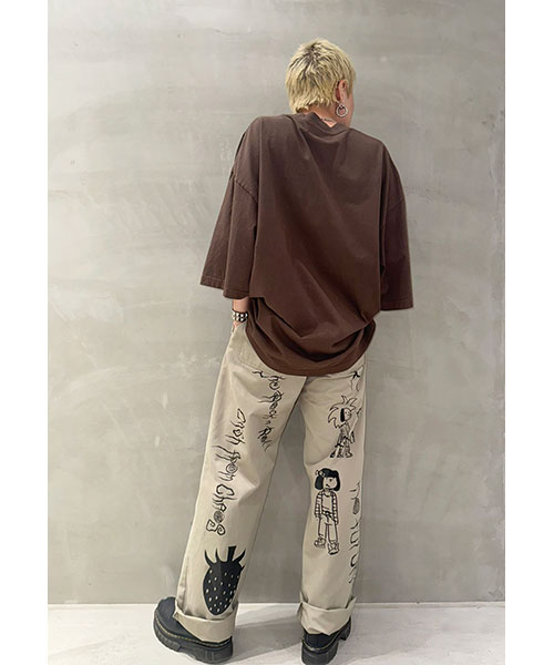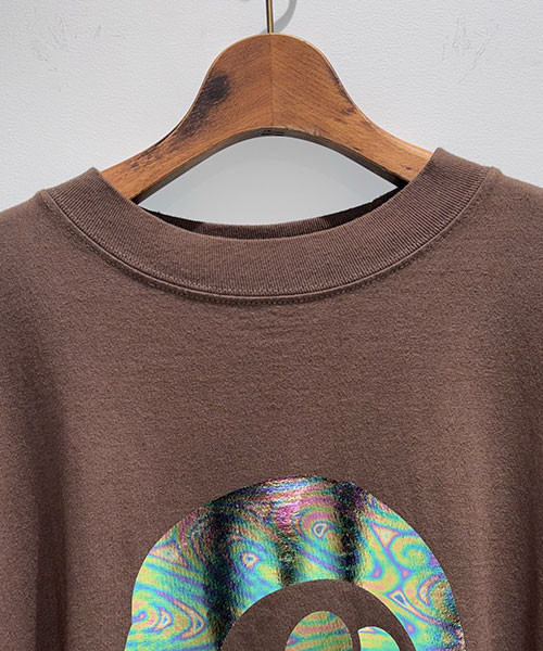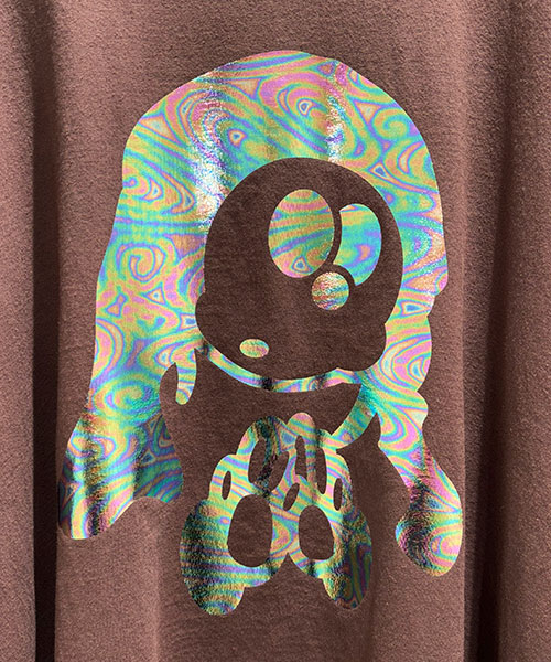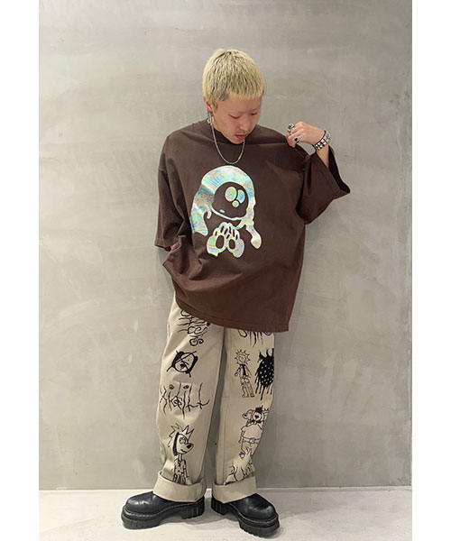 現代アーティスト「A2Z」氏の手がけたオリジナルキャラクターグラフィックが光の角度により虹色に輝く箔プリントで落とし込まれた一着。顔料染め加工が施されたボディはワイドシルエットでゆったりと着用いただけます。