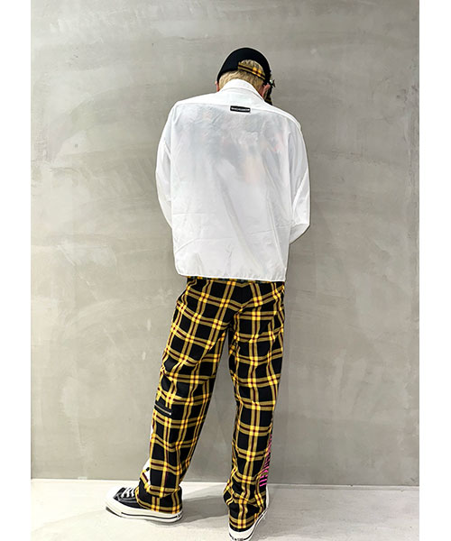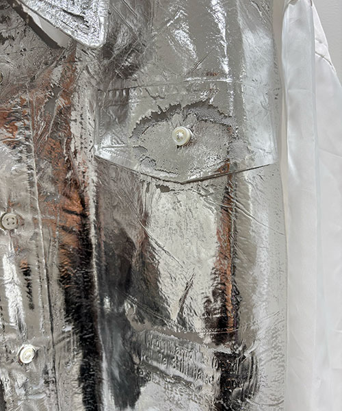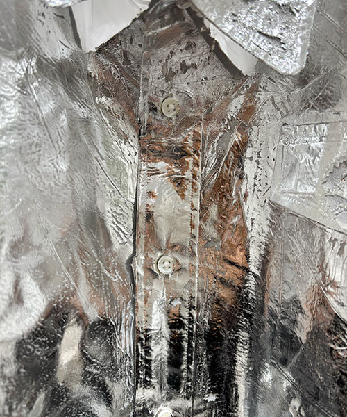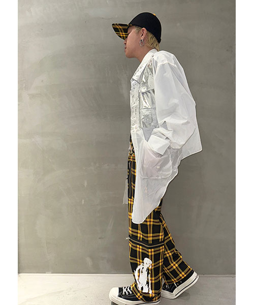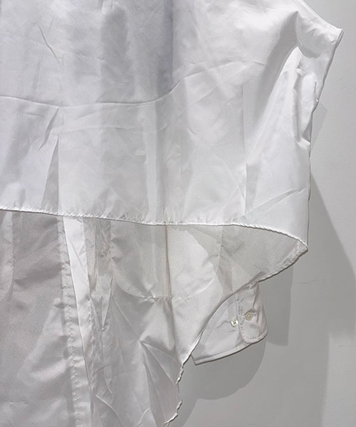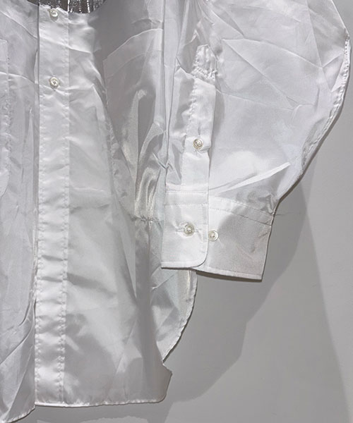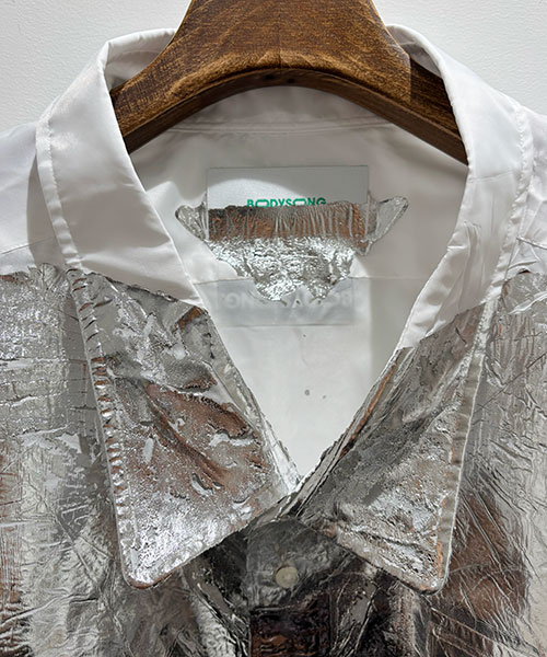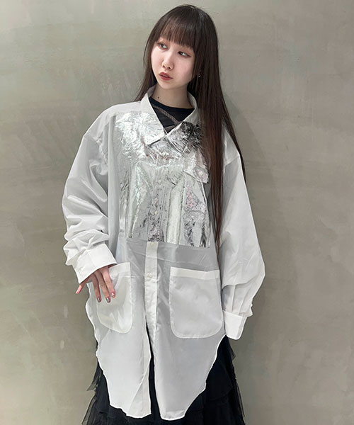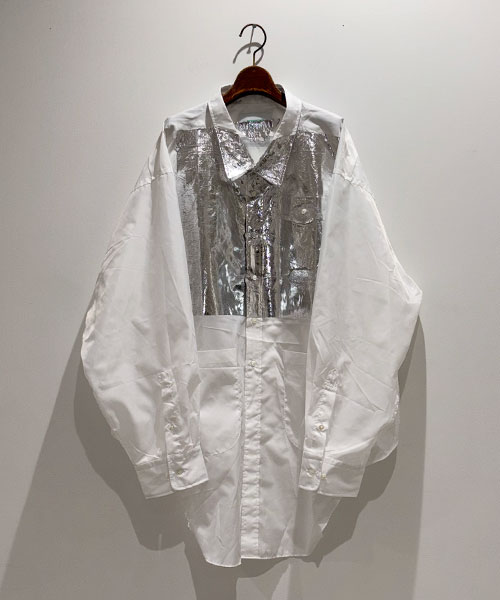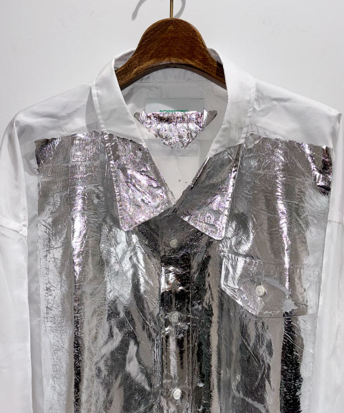 前後の丈がアシンメトリーになった独特なシルエットの変形シャツ。フロント部分は縫製後に箔加工が施され、独特な光沢感が印象的です。