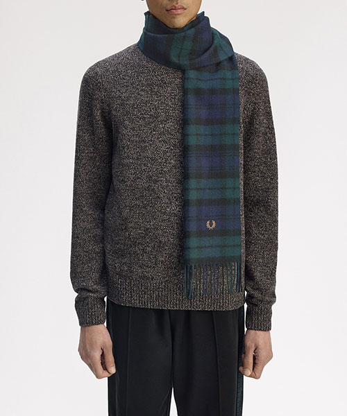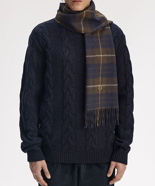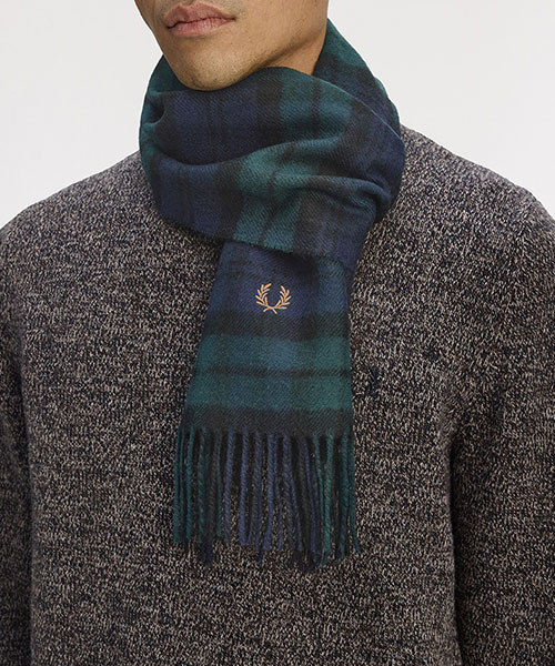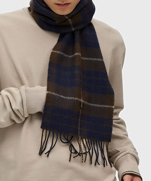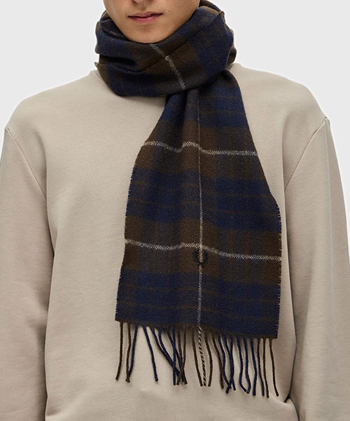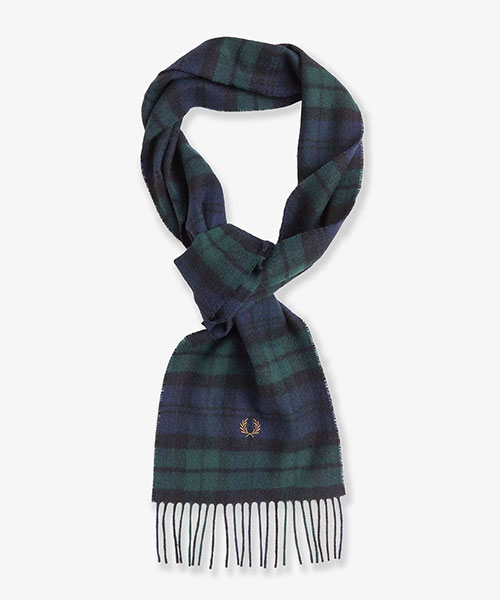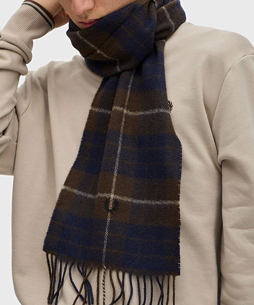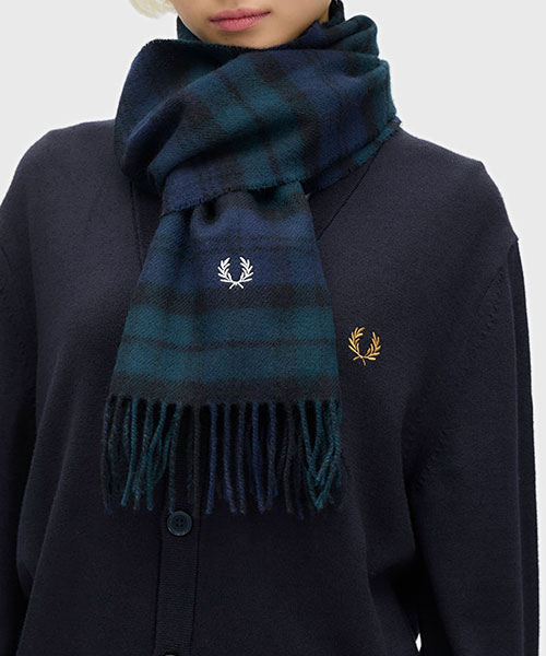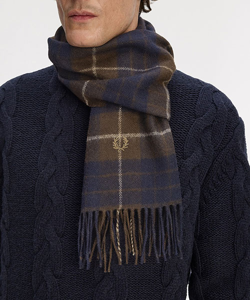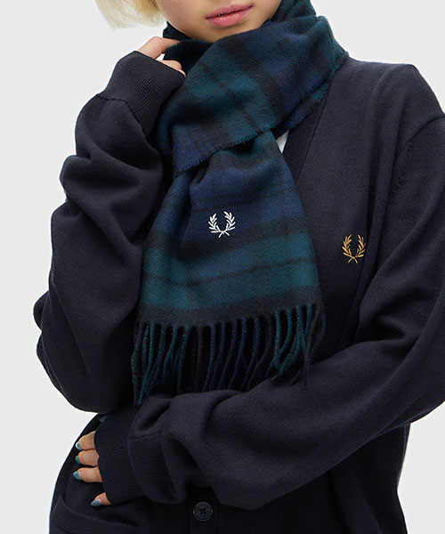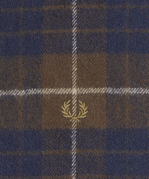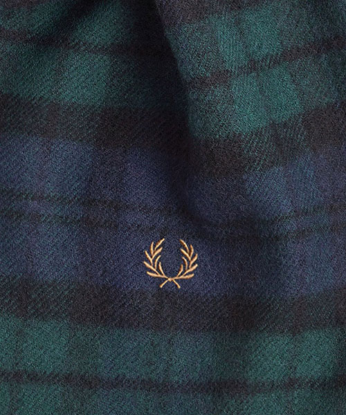 ラムウールを使用したタータンチェックのマフラーです。 フリンジとローレルリースの刺繍でデザインされています。おすすめギフトBRAND CONCEPT