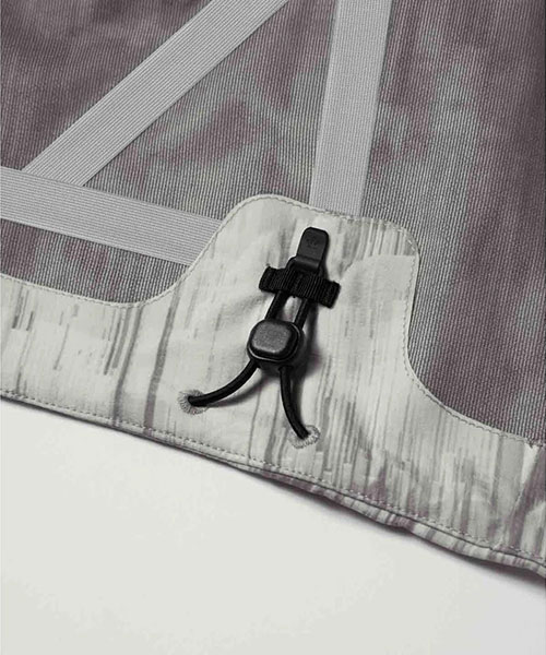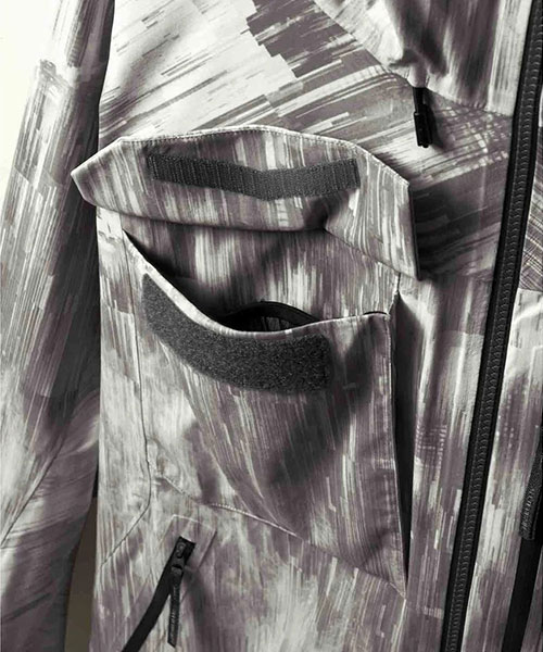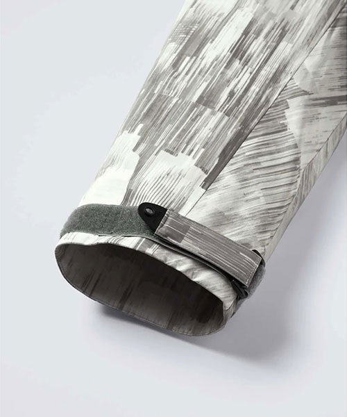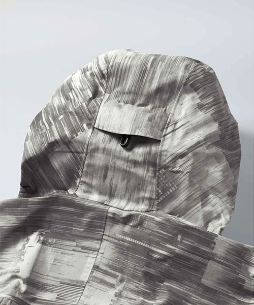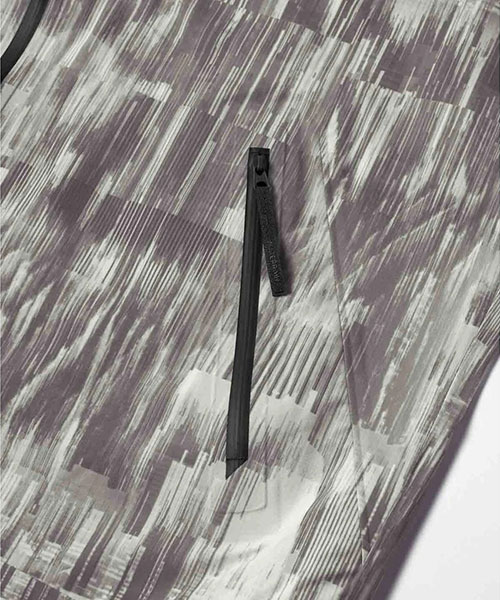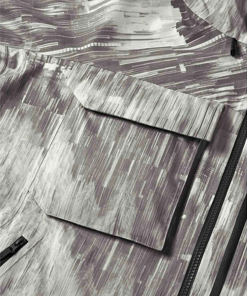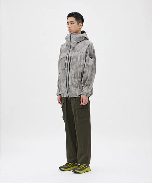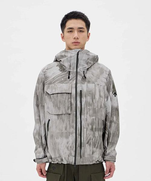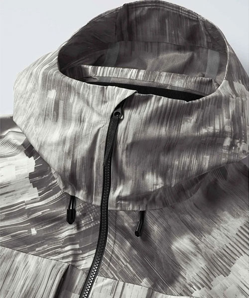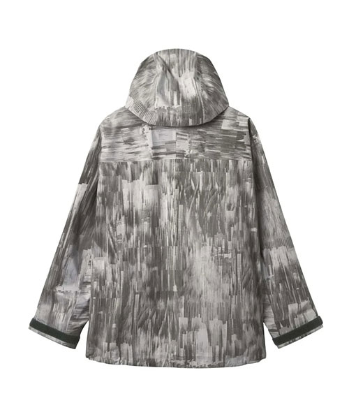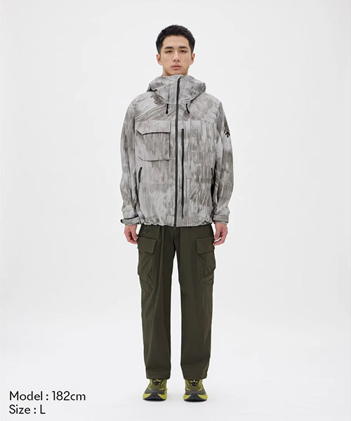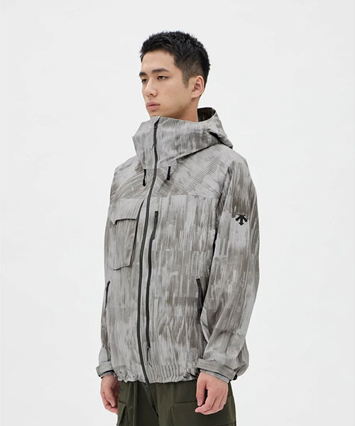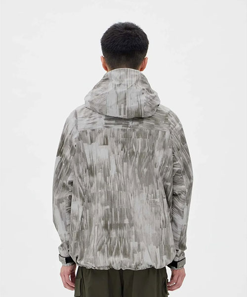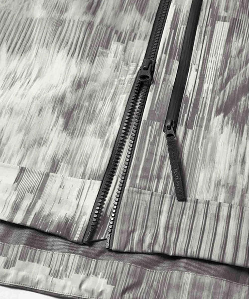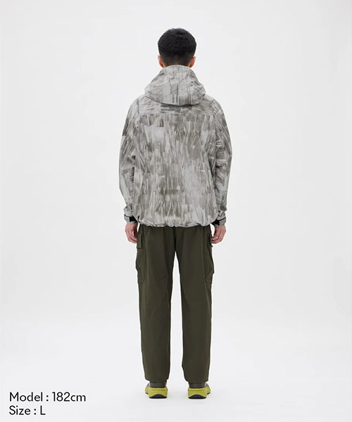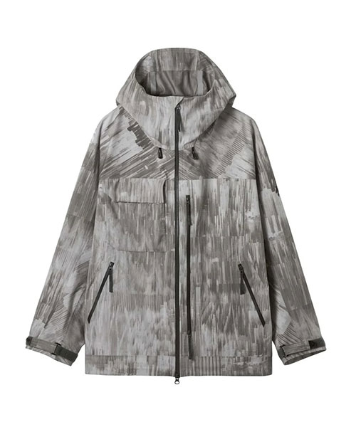 防水透湿性、防風性を持つ3レイヤー素材を採用したシェルジャケット。都市とフィールドをモチーフに描いたオリジナルプリント“ZENCHIKEI PATTERN”のファブリックデザイン。