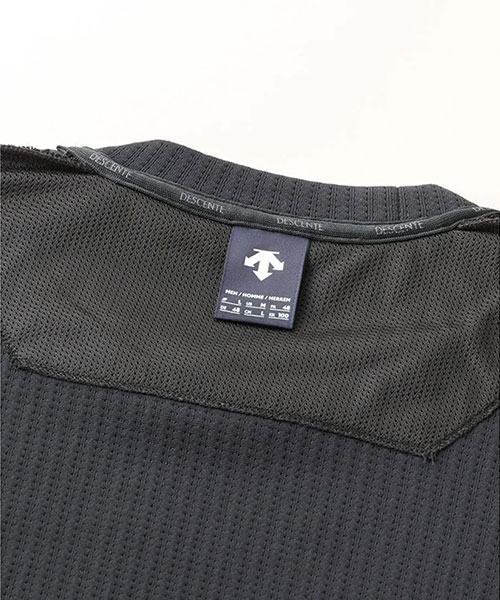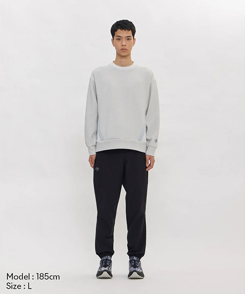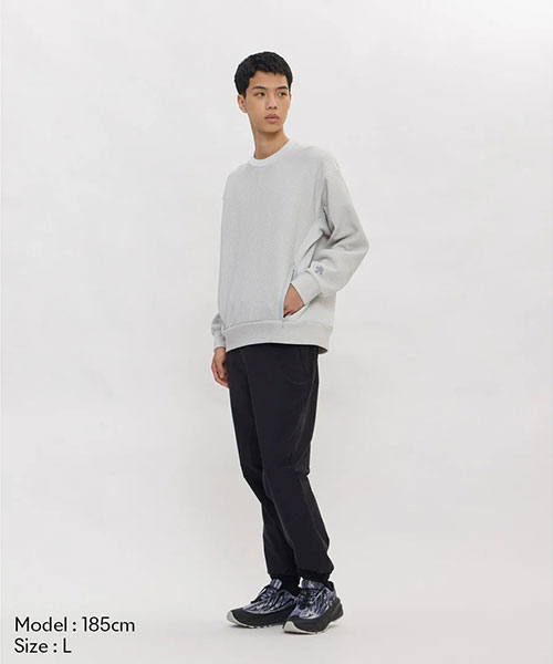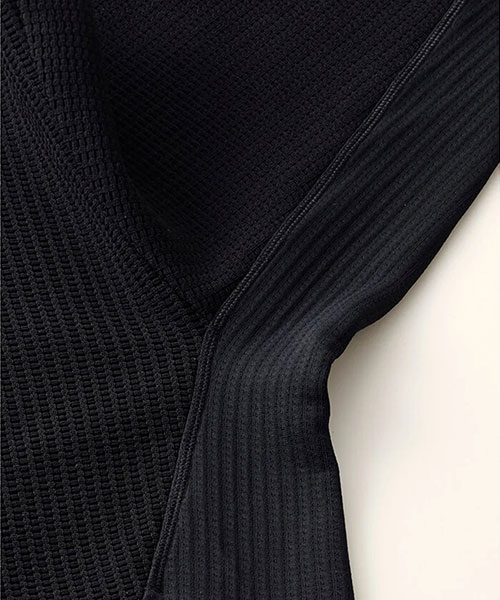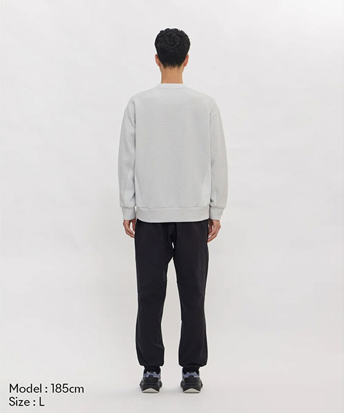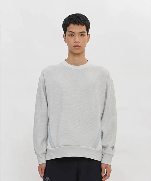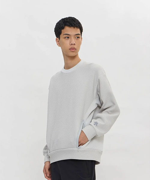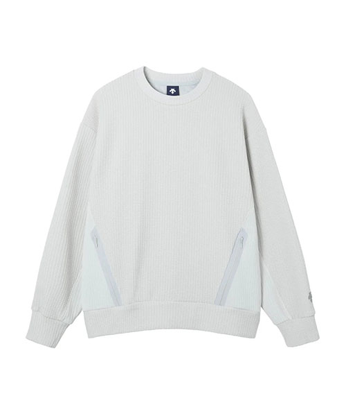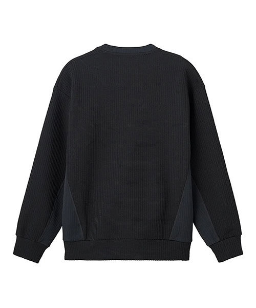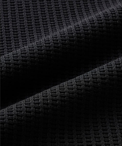 凸凹とした表面感のあるワッフル素材を使用したクルーネックプルオーバーシャツ。UVカット性に優れたスポーツ由来の機能性ワッフル素材を採用し、脇身頃にかけて表地と裏地をコンビネーション使用したユニークな仕様。