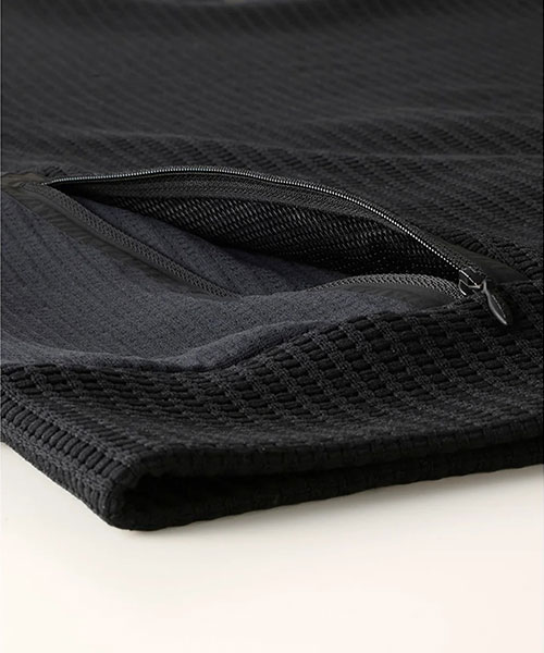 両脇身頃には転写シート仕様のファスナーポケットを配し、プルオーバーシャツながら収納力のあるデザイン。