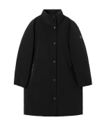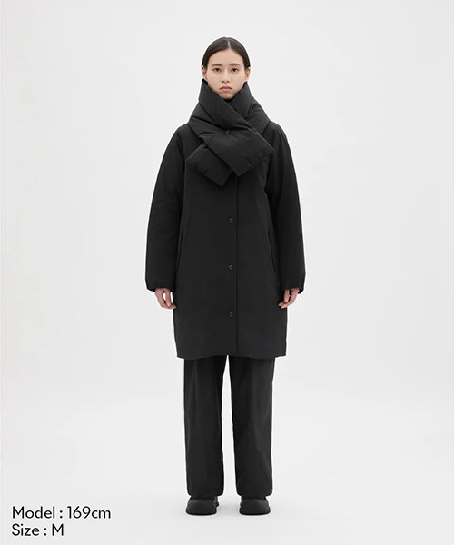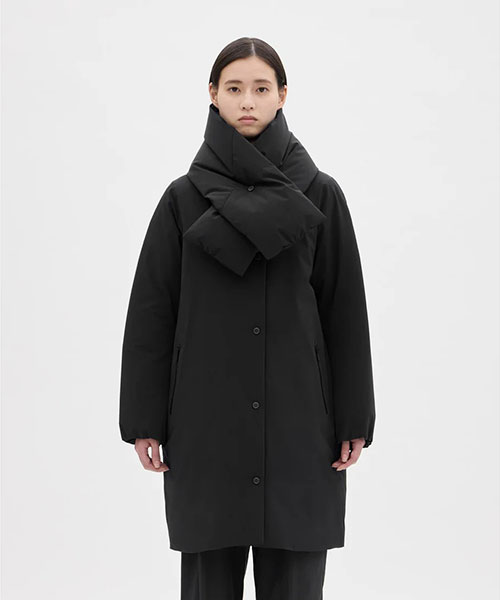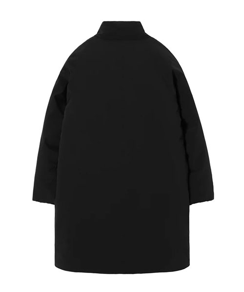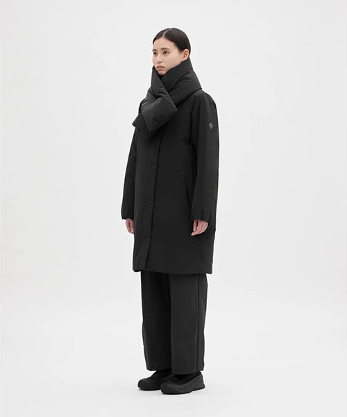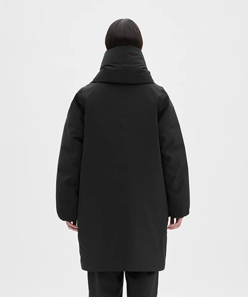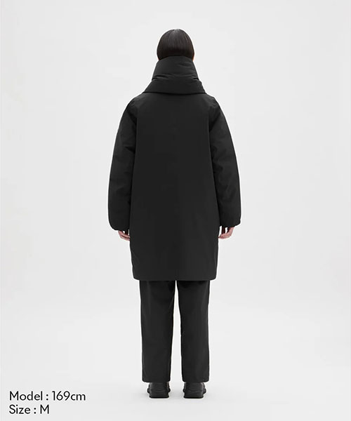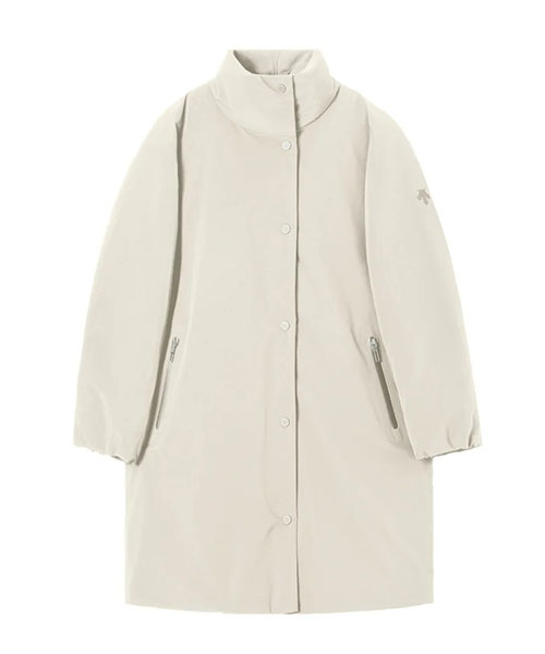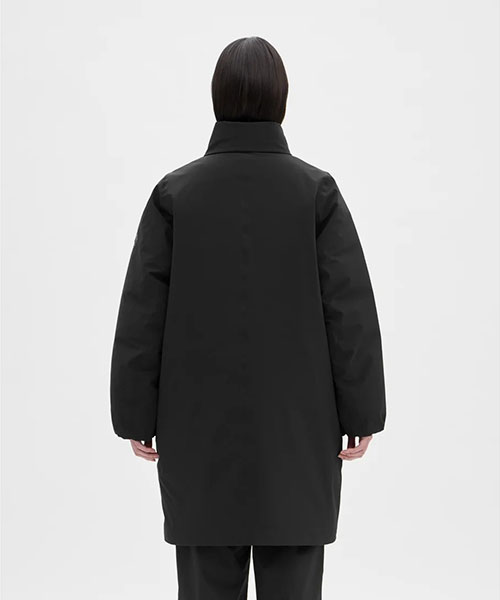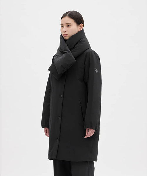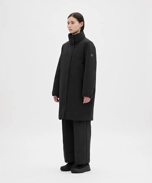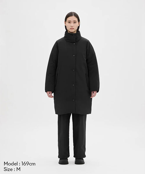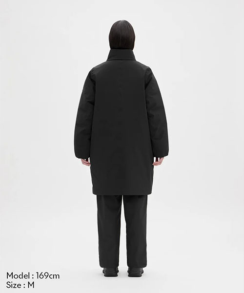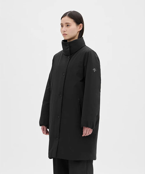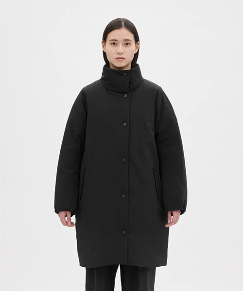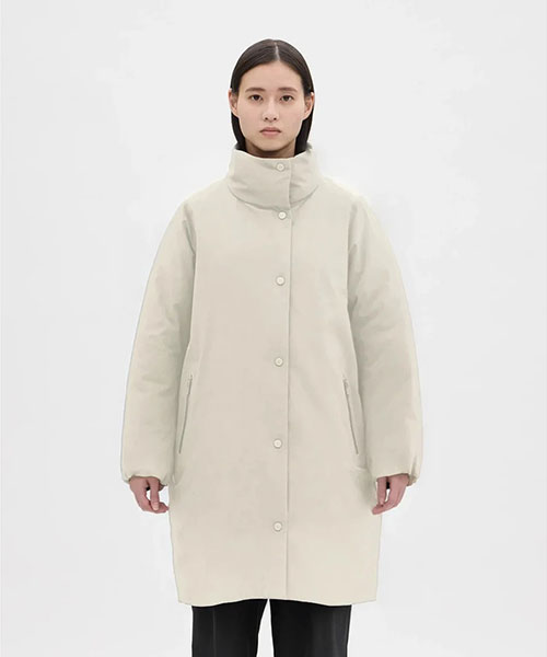 水沢ダウン”INVISIBLE”シリーズのスタンドカラーコート「INV-03L」。高いウォータープルーフ性能はそのままに、熱接着ノンキルト加工やその他ディテールを全て製品の内側に潜め、より都会的でミニマルなデザインを実現したシリーズ。さりげない丸みのあるコクーンシルエットが女性らしいモダンなバランスを実現。ミドルレングスでスカートにもパンツにも合わせやすい汎用性の高い丈感が特徴的。充填するダウンの密度を従来モデルの約70%に抑え、日常生活での快適性を追求した軽量モデル。表地には防水透湿性に優れるDERMIZAX® FLEXILE MATTE 4WAY STRETCHを、中生地には光を熱へと変換し積極的な保温性能を発揮するHEAT NAVI®/ヒートナビを採用。同素材のダウンマフラーを備え、ビジネスからカジュアルまで幅広いシーンで着用可能。さらに「DOWNPASS」認証を取得したトレーサブルダウンを使用しシリアルナンバーによる厳正な管理を行うことで全ての羽毛の調達過程を追跡することが可能。