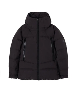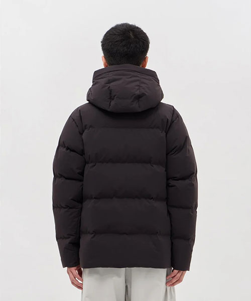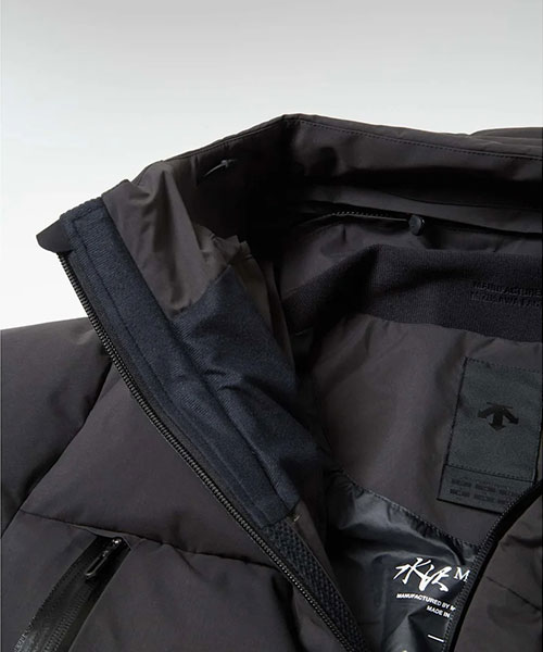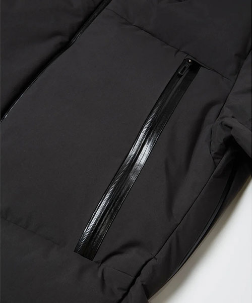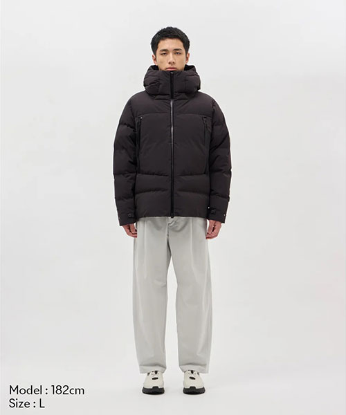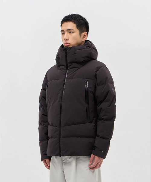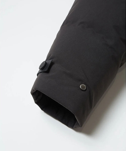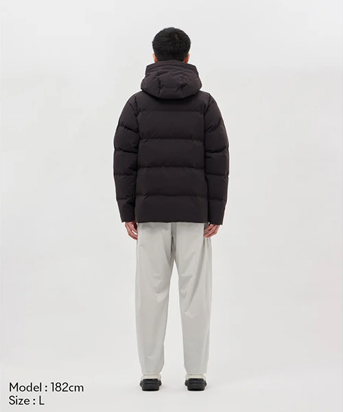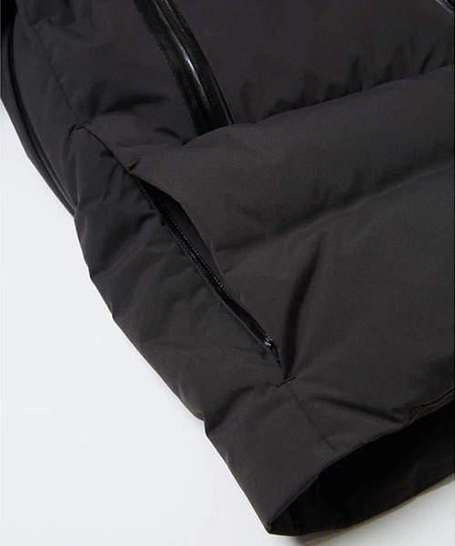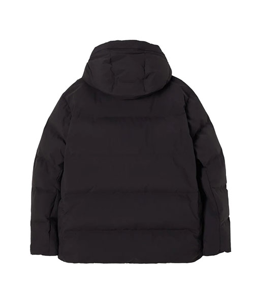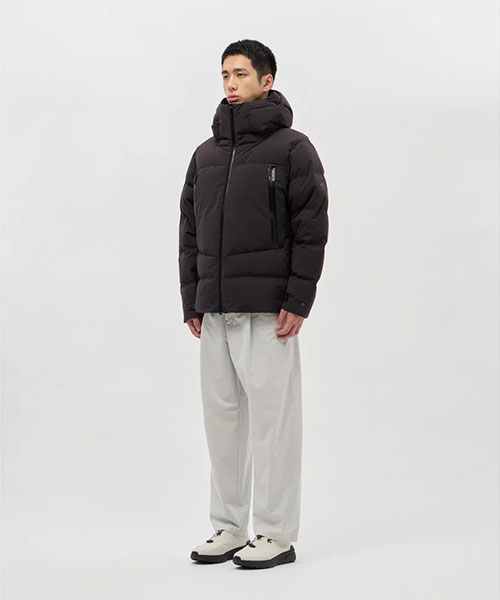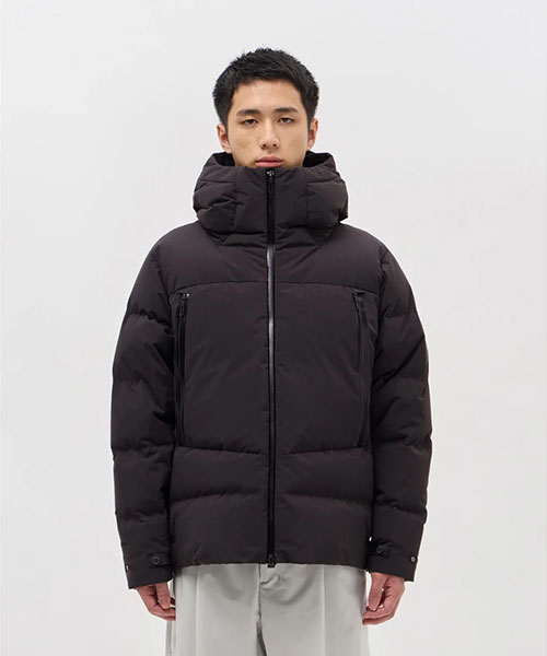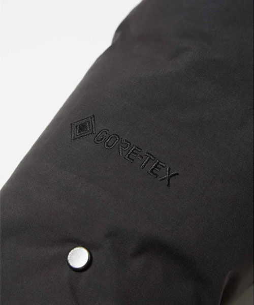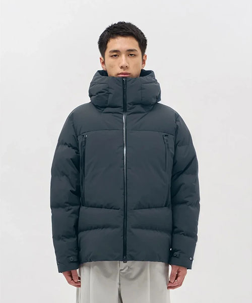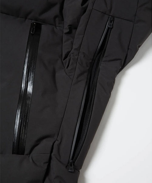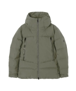 リサイクルナイロンを使用した、コットンライクでナチュラルな風合いが特徴のGORE-TEX 60d NATURAL PLAIN WEAVEを採用。アウトドアアクティビティなど様々な環境に対応する水沢ダウンジャケットのパフォーマンスモデル。熱接着ノンキルト加工とシームテープ加工による高い防水性能に加えて、ゴアのテクノロジーのあらゆる性能は、過酷な環境、条件に対応するための丈夫さ、防風性を兼備。フードには、雨や雪などの悪天候下での着用を考慮し、フードに水や雪だまりを防ぐパラフードシステムを搭載。フロントジッパー部分に採用されたデュアルジップベンチレーションは、2列のジッパーとその間に配置されたメッシュ生地により衣服内に外気を取り込み、ジャケット内にこもりやすい不快な熱や湿気を逃がすことが可能。そして袖先にはスナップボタンによるアジャスターシステムを備え、フィット感の調節が可能。さらに「DOWNPASS」認証を取得したトレーサブルダウンを使用しシリアルナンバーによる厳正な管理を行うことで全ての羽毛の調達過程を追跡することが可能。