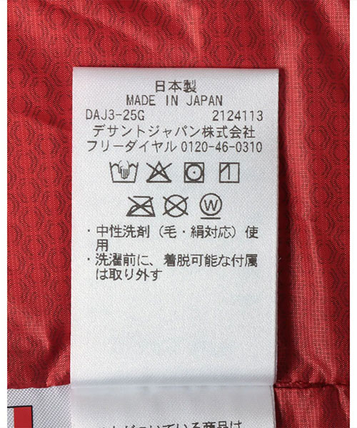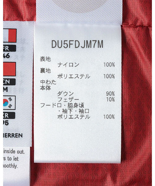 | 素材 | 表地:ナイロン100% 裏地:ポリエステル100% 中わた 本体:ダウン90%、フェザー10% フード口・脇身頃・袖下切替部:ポリエステル100% |