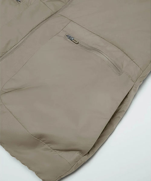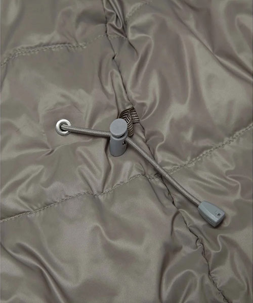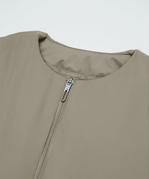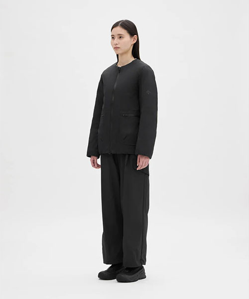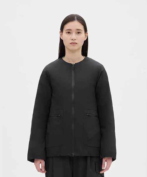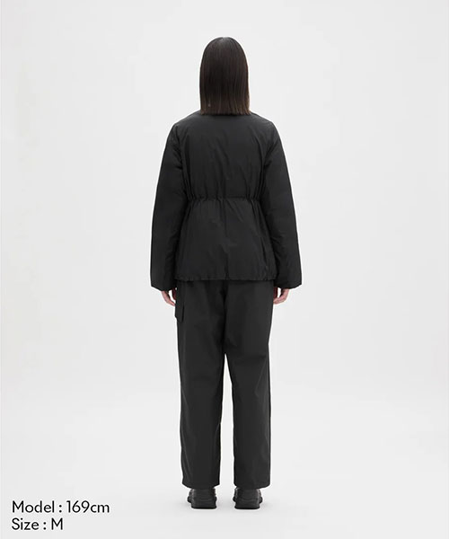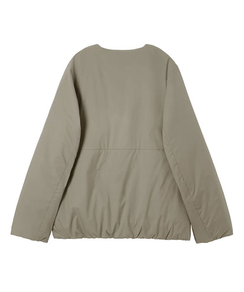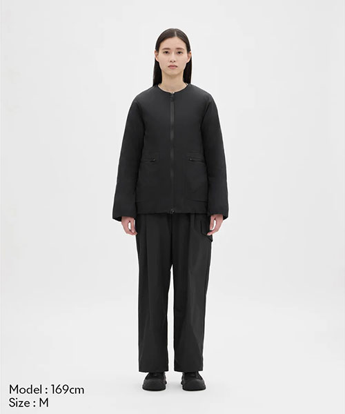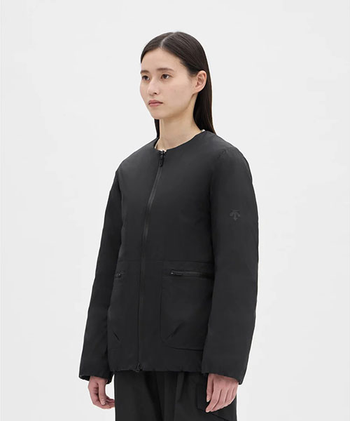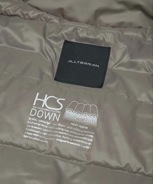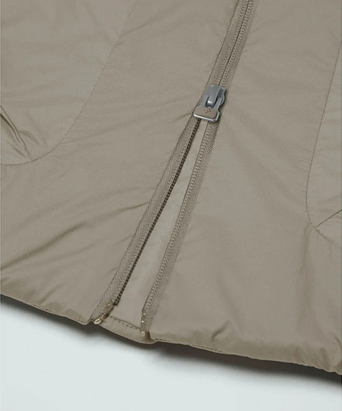 コールドスポットを軽減、熱を外部に逃がさないH.C.S(ヒートサーキュレーションストラクチャー)ダウン構造を採用。アウターやレイヤリングアイテムとして活用可能な商品、薄型の設計。 後ろのウエスト部分はブラウジングできシルエットの変更が可能。袖はHEAT NAVI/ヒートナビ中綿、身頃はダウンを採用、表地は撥水機能有り。