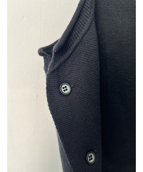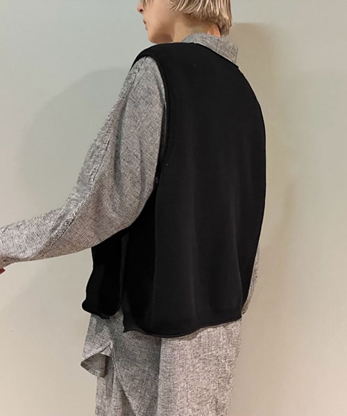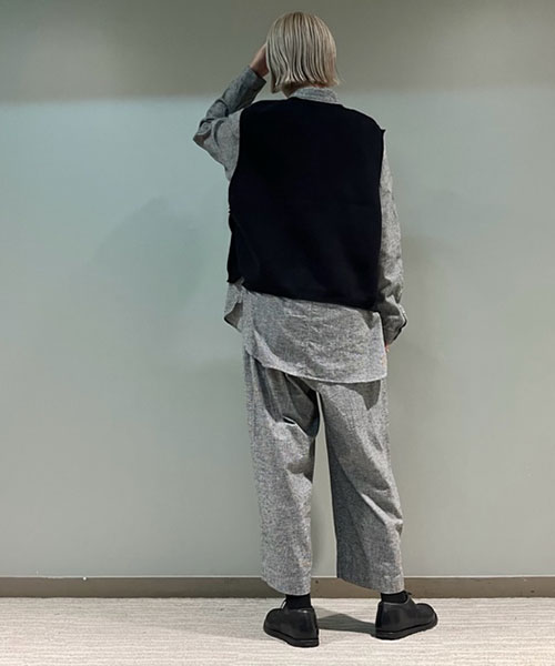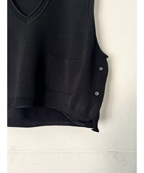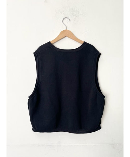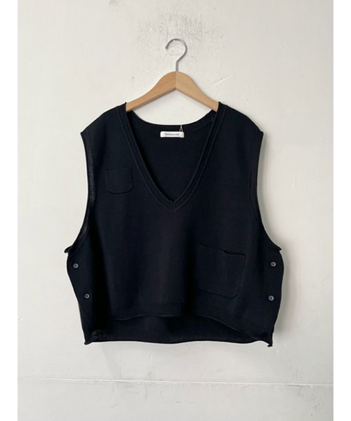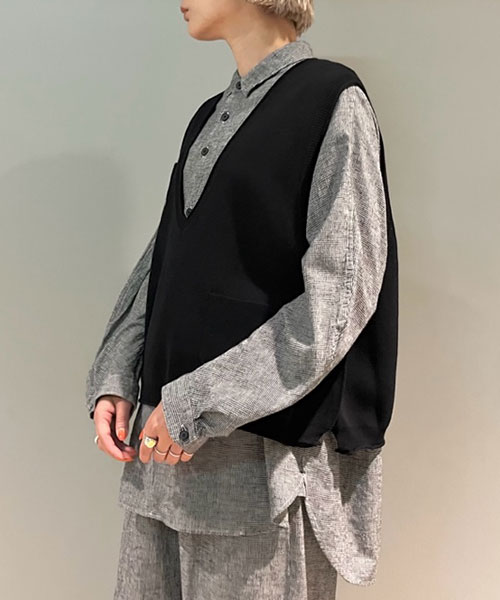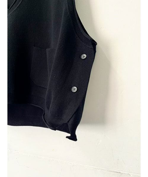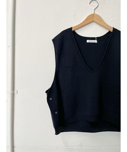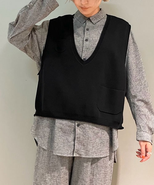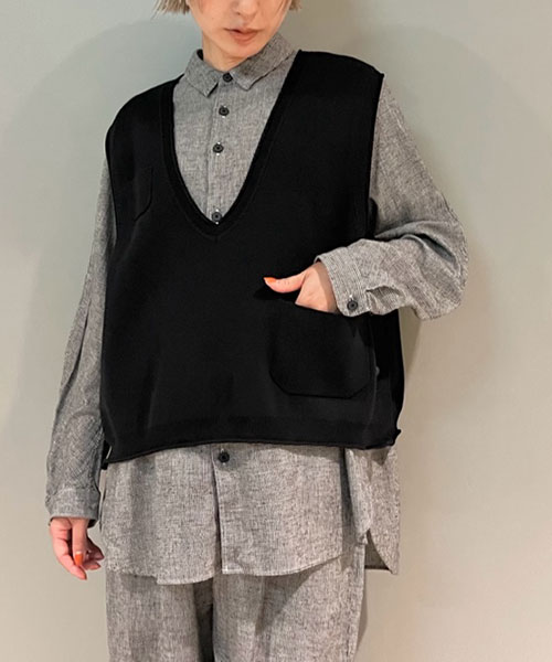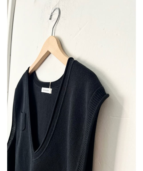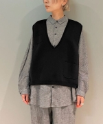 しっかりとした編み地とリブの組み合わせで丸みのあるシルエットが特徴の定番素材を使用したベスト。深めのVネックはブラウスやタートルに合わせてもすっきりとした見た目で着用いただけます。