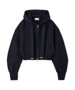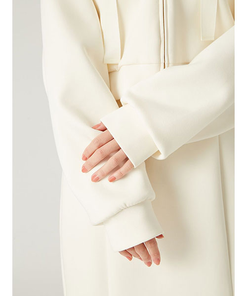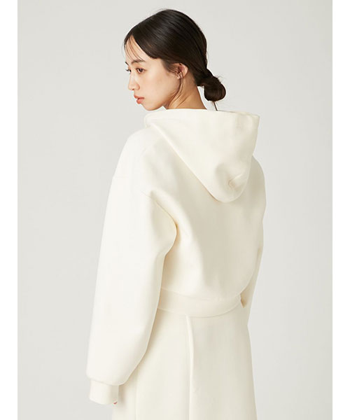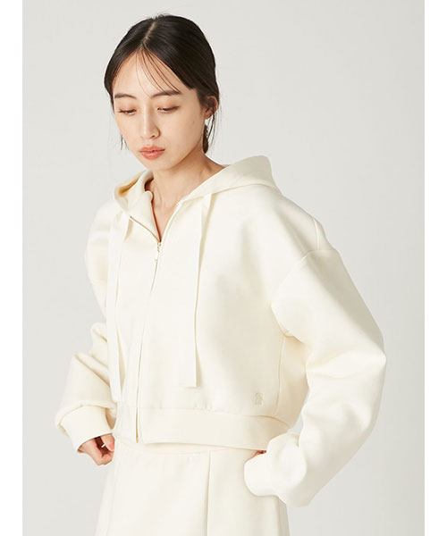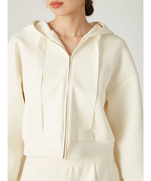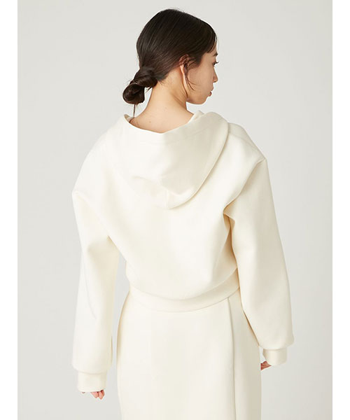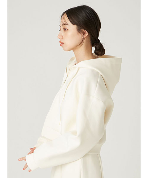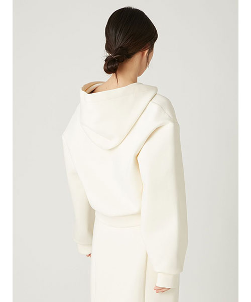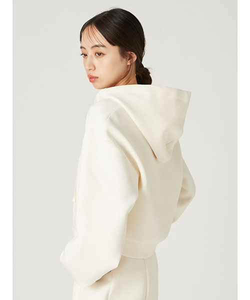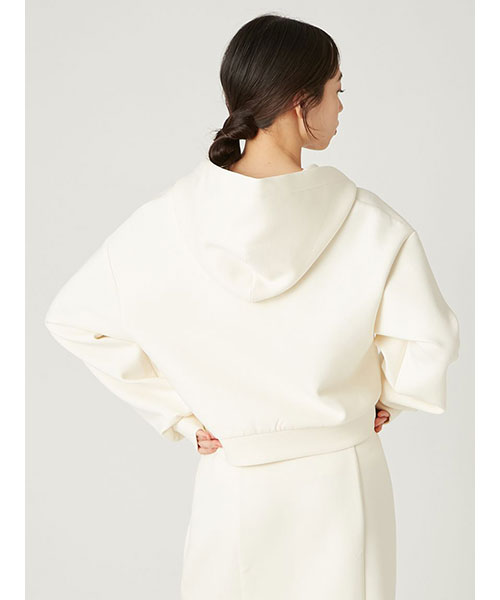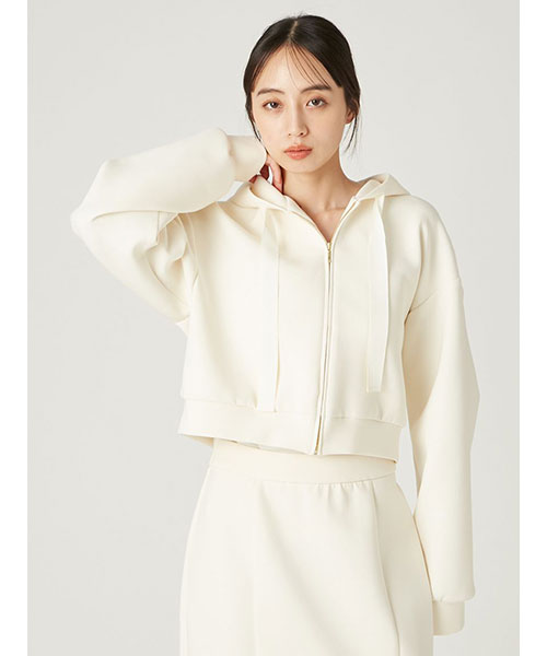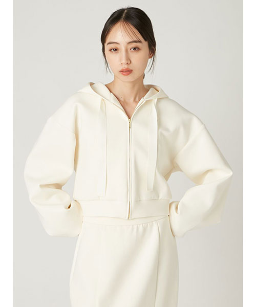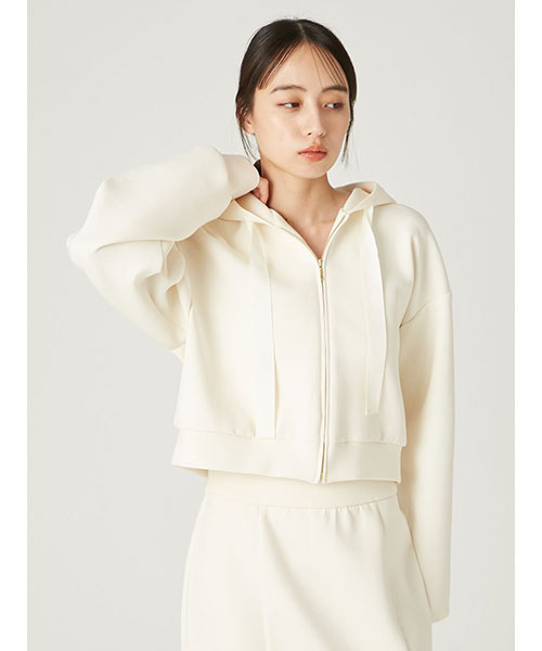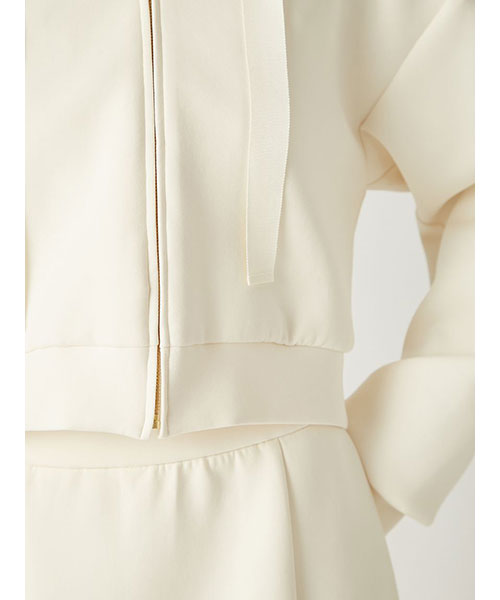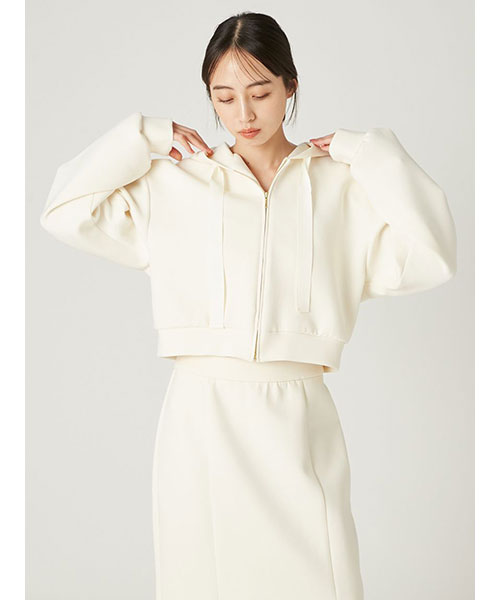 すっきりとしたコンパクトなボディに、ボリュームスリーブのシルエットが今季らしいジップアップフーディー。