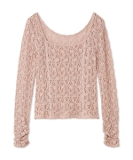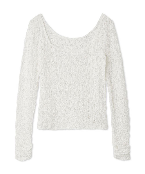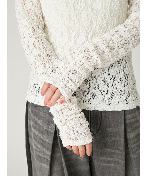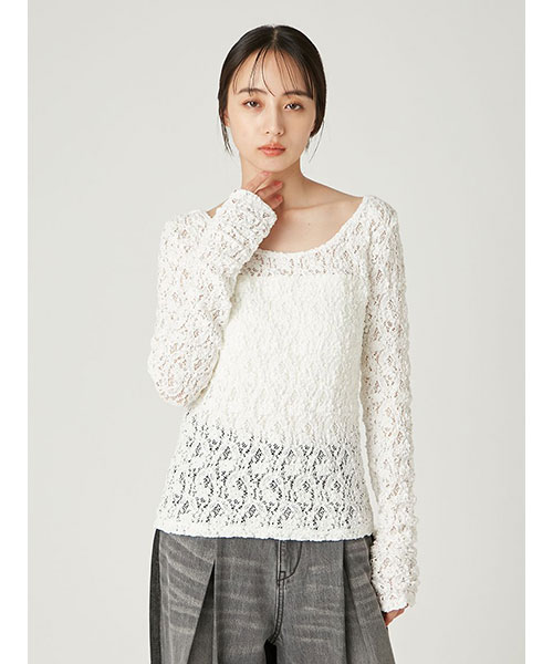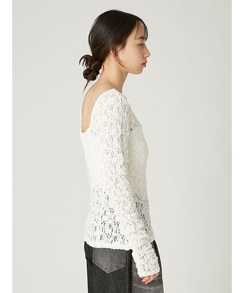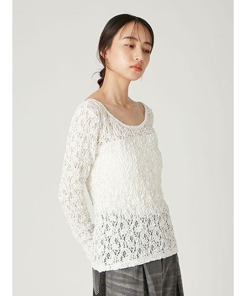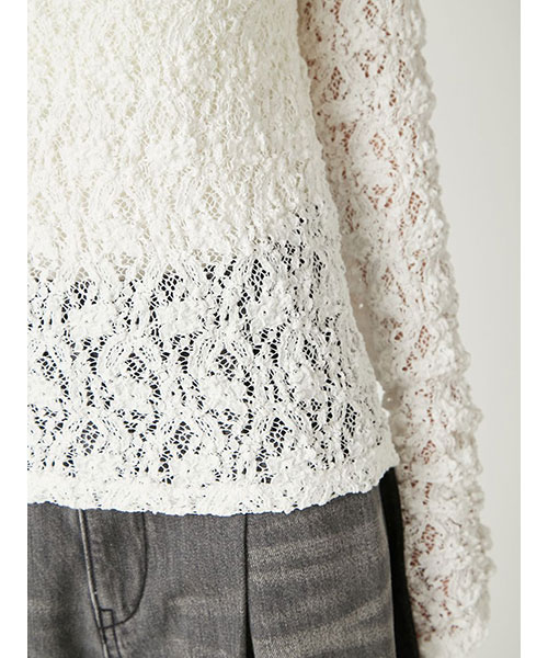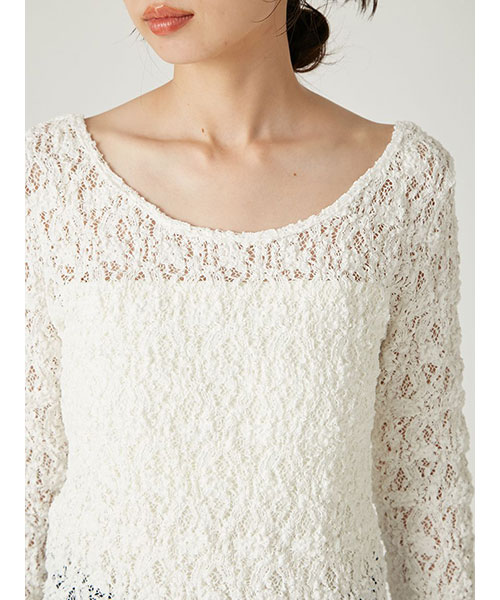 花柄の隙間から肌が透けるような、程よいシアー感が上品な女性らしさを演出するレーストップス。