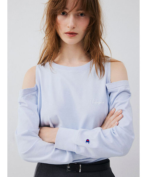 【<Champion × FRAY I.D>スポーティーさとモード感が融合。ロンTを、女性らしさもある肩あきのデザインに】※CGRYの色味が変更になります。商品単品画像をご参照下さい