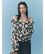 【肩ストラップでアシメにも着こなせるデザインシャツ。オリジナルのラメ入りチェックがトレンド感アップ】【Design/Styling】