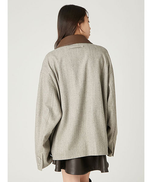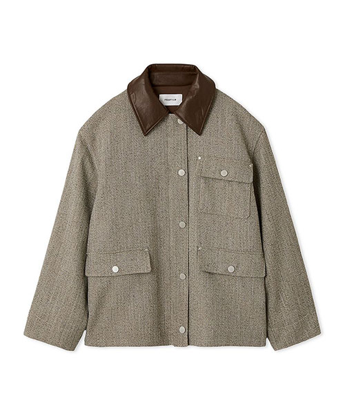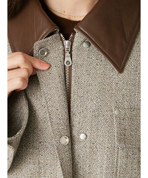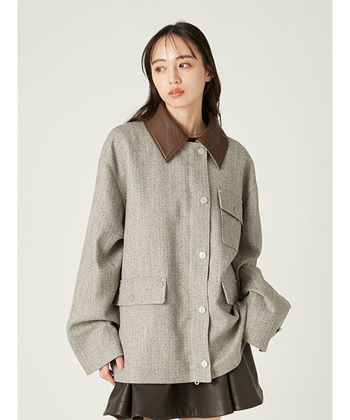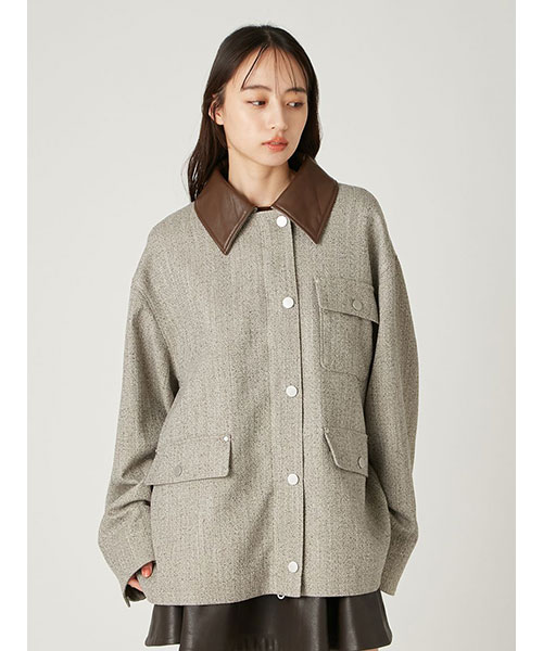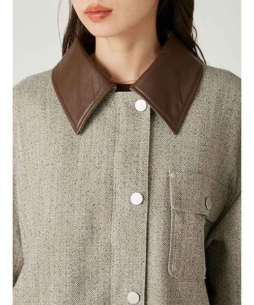 BEGは、リサイクルポリエステルを使用した軽やかなヘリンボーン柄ツイードです。襟はフェイクレザー。