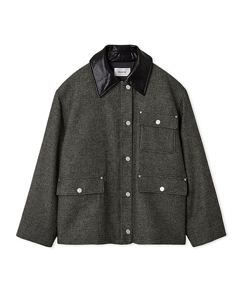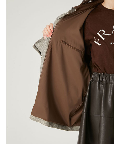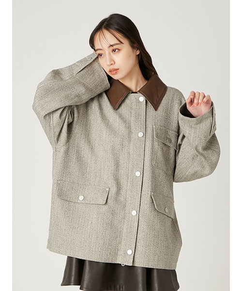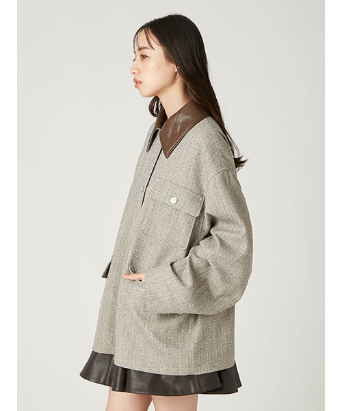 GRYは、ウール、レーヨン、ポリエステルをミックスしたエレガントなツイード調。襟はフェイクレザー。
