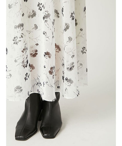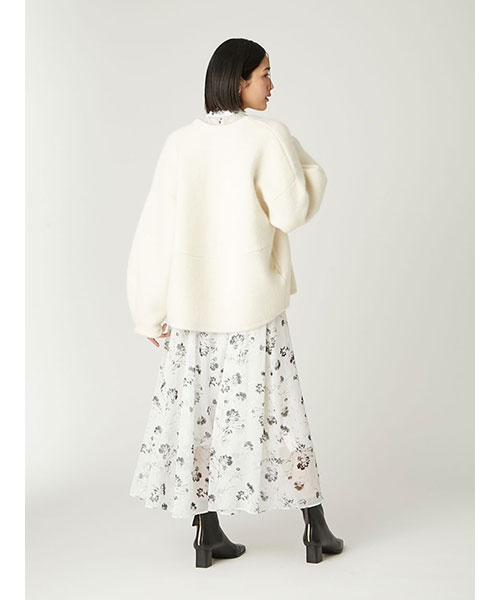 胸元を華やかにした分、袖やスカートはシンプルなデザインに。スカートはたっぷりとしたフレアシルエットにまとめ、程よいバランスに仕上げました。