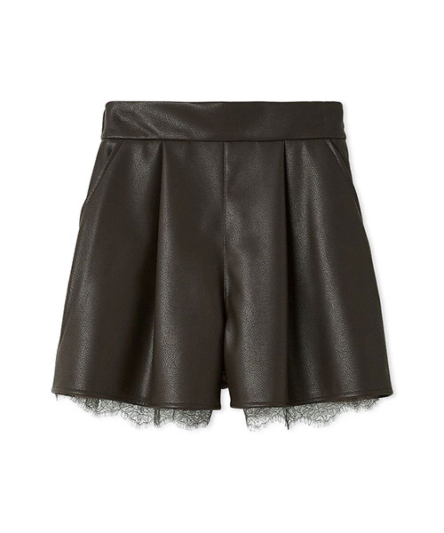 フェイクレザーのタック入りショートパンツに、レース付きのインナーパンツを組み合わせた、こなれ感のある一枚。