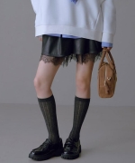 フェイクレザーのタック入りショートパンツに、レース付きのインナーパンツを組み合わせた、こなれ感のある一枚。