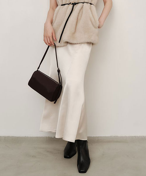 控えめな光沢が上品なサテンを使用した、すっきりと見える落ち感のナロースカートです。