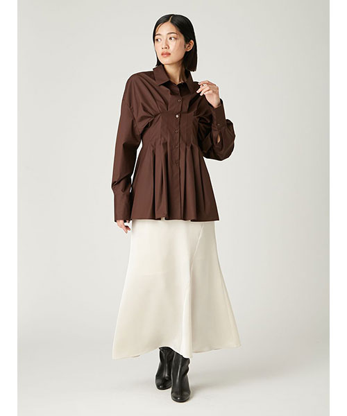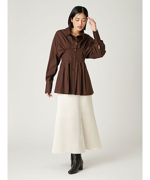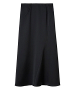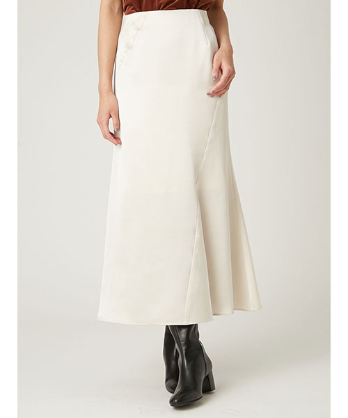 【上品な光沢のあるサテンをモードに仕立てた、スタイルアップできるナロースカート】【Design/Styling】