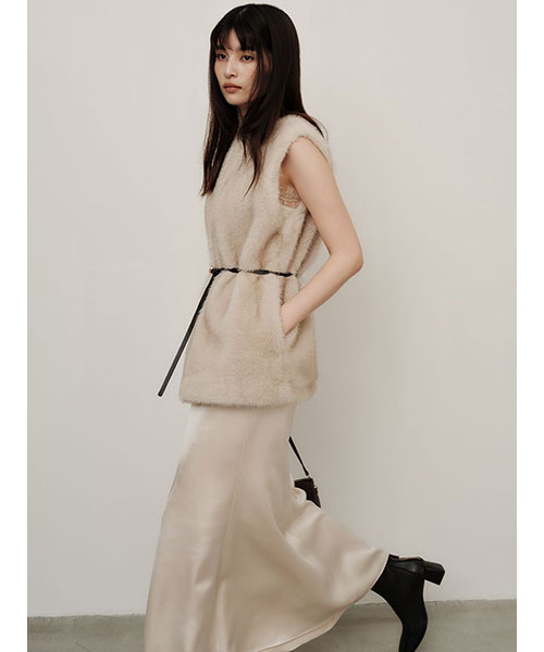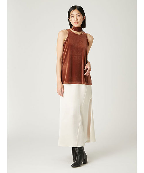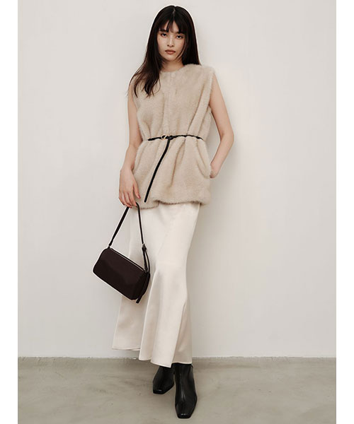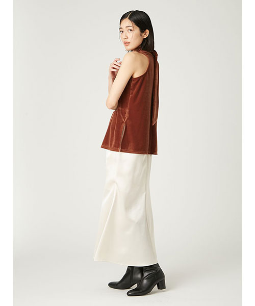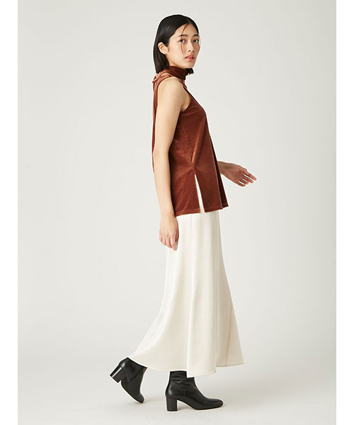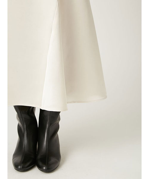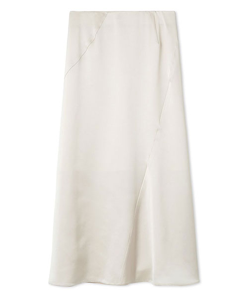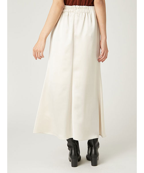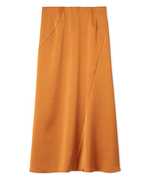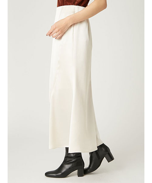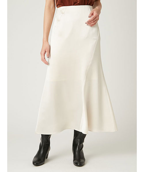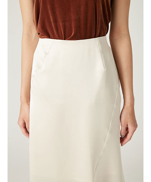 控えめな光沢が上品なサテンを使用した、すっきりと見える落ち感のナロースカートです。