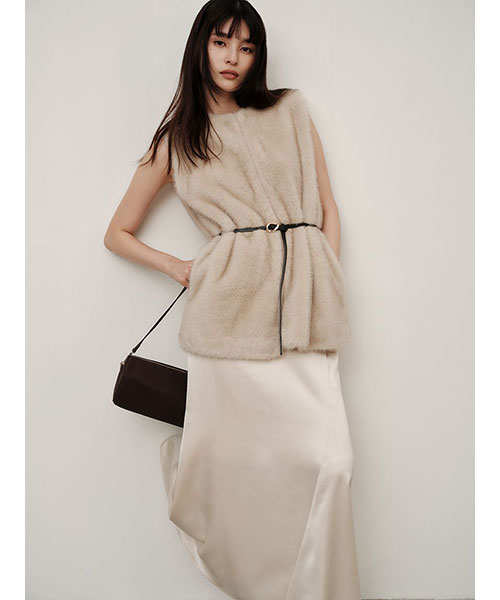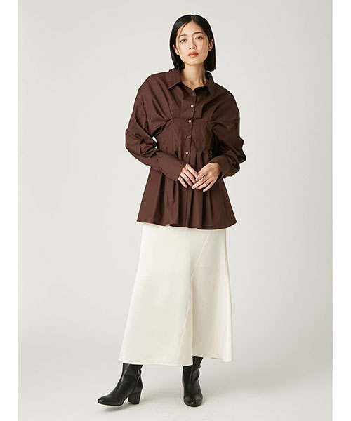 斜めに入った切り替えがモードな雰囲気で、着こなしの鮮度もアップ。