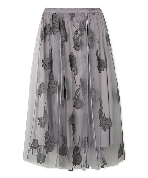 繊細なチュールをベースに、フェイクスエード素材と刺繍を重ねた、ラグジュアリーなスカートです。