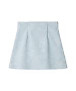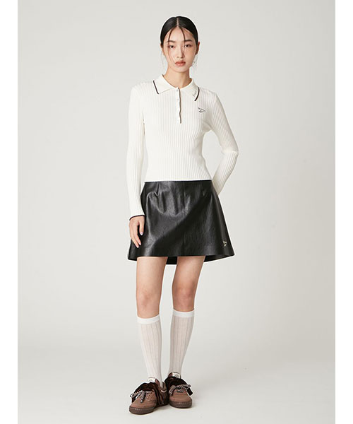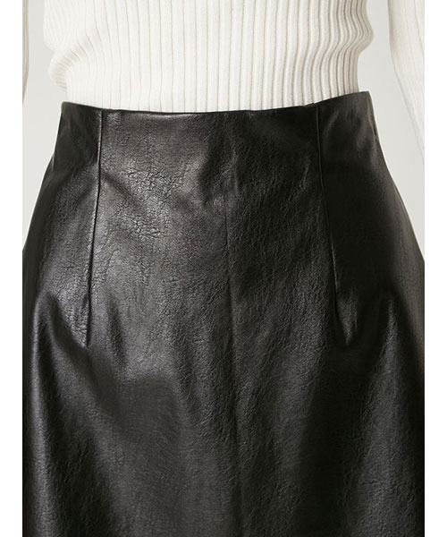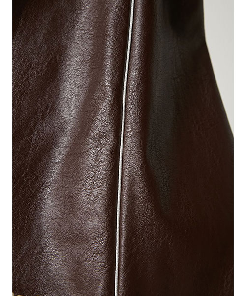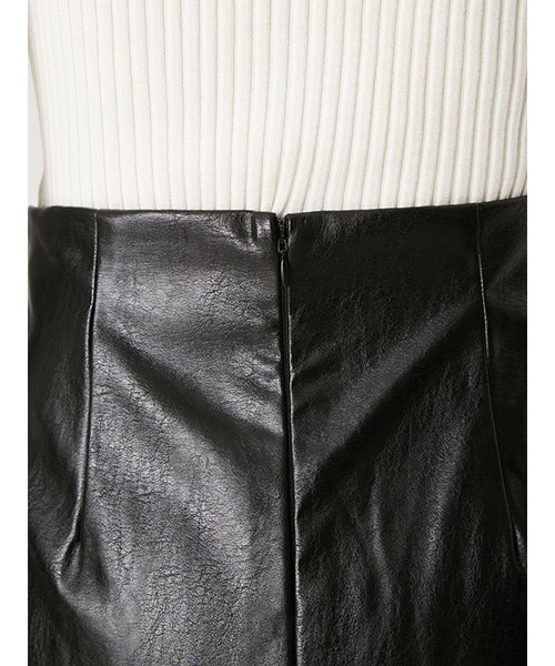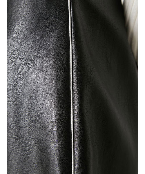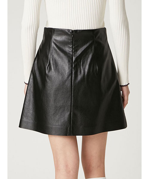 シルバーのラメパイピングが効いたミニマルなミニスカートは、レザーライクなファブリックを使用することでグッとモードに。