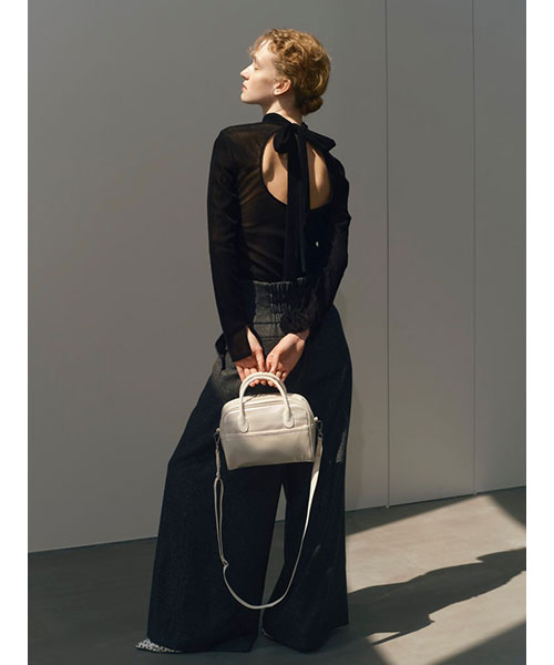 ボディとの質感のコントラストが、フェミニンモードな印象を作ります。