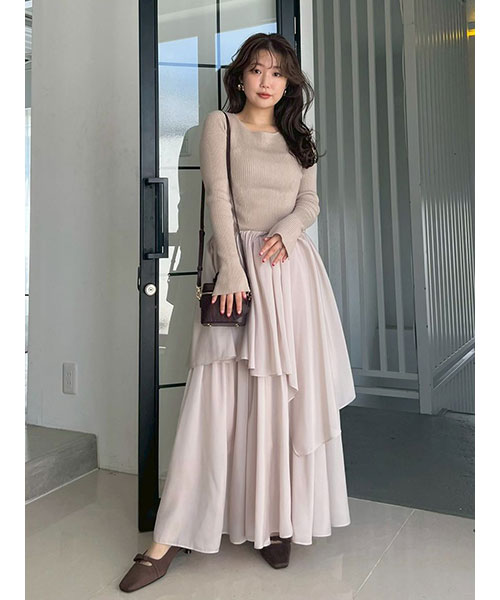 分量感をたっぷりと持たせた軽やかなスカートは、アシンメトリーのティアードデザインがモードな雰囲気を引き立ててくれます。