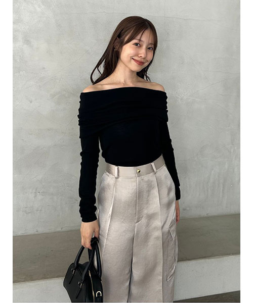 オフショルデザインのプルオーバーで、シンプルながらデコルテを見せるデザインは女性らしさを引き立ててくれます。