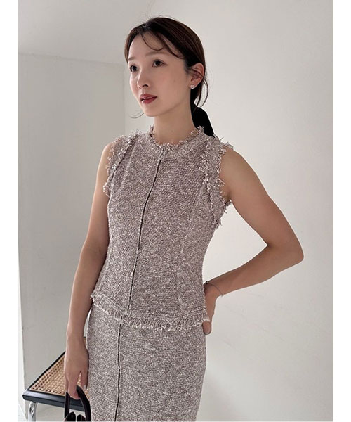 【こだわりの糸で編み立てたツイードライクなニット地を、モードな印象のジレに】