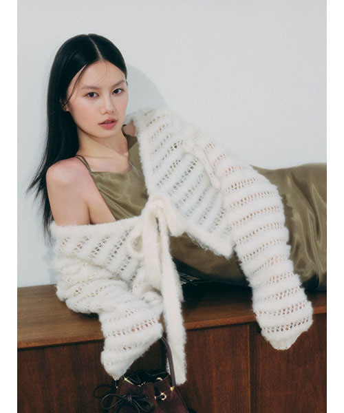 ふわりとした毛足の部分と、透け感のあるネット編みの部分がボーダー状になった、個性的な編み地のカーディガン。
