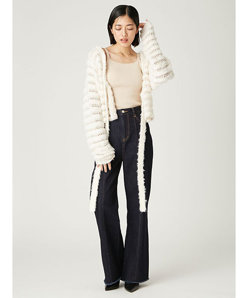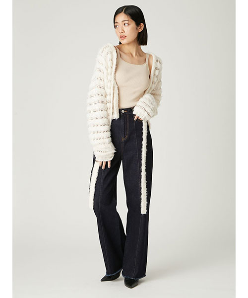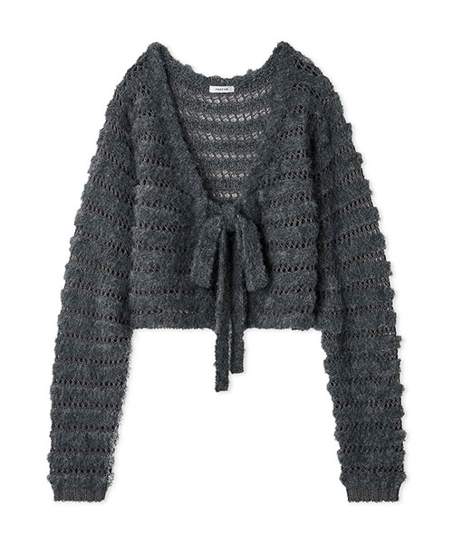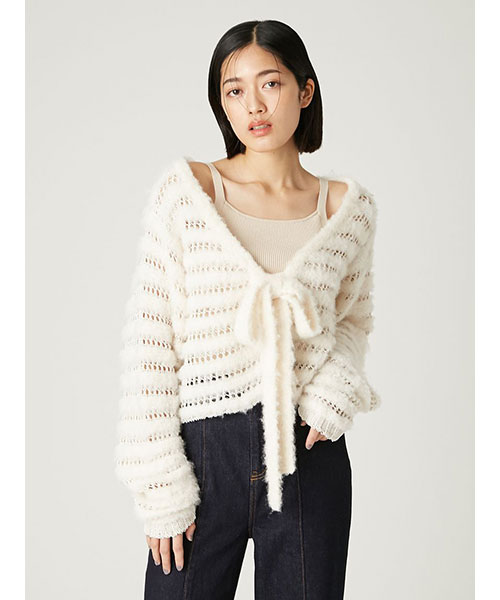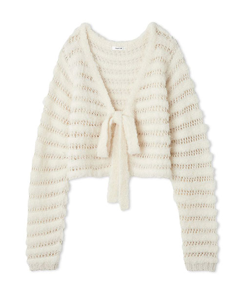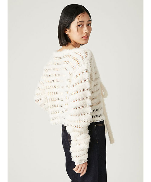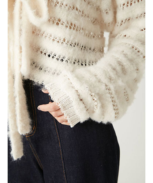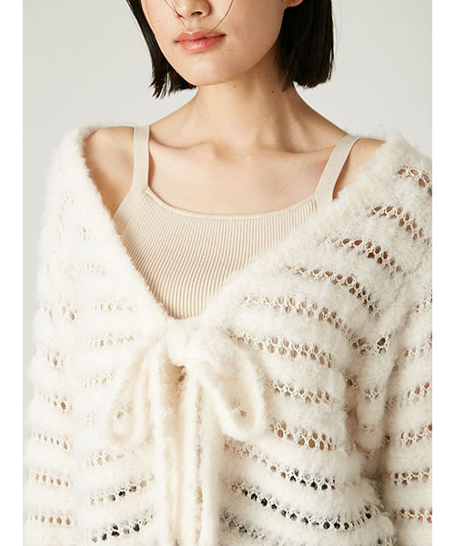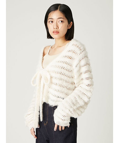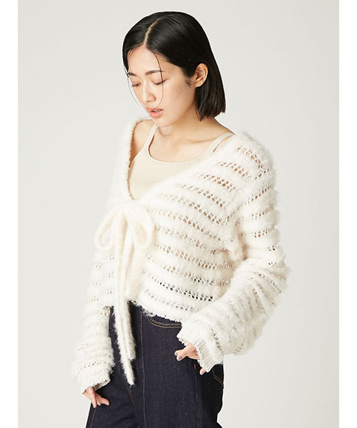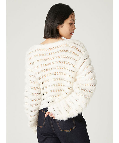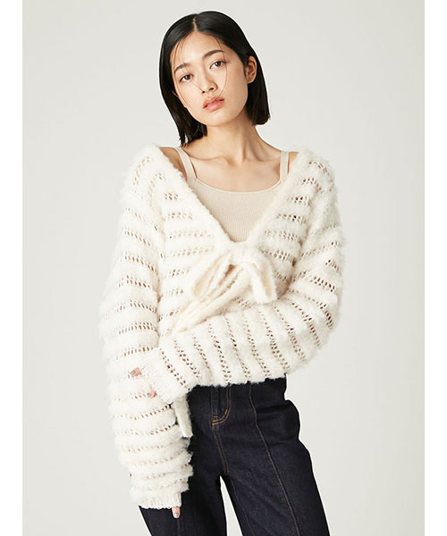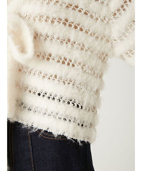 ふわりとした毛足の部分と、透け感のあるネット編みの部分がボーダー状になった、個性的な編み地のカーディガン。