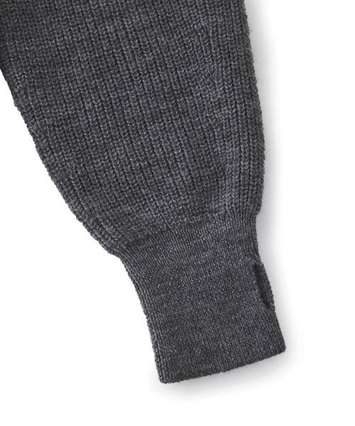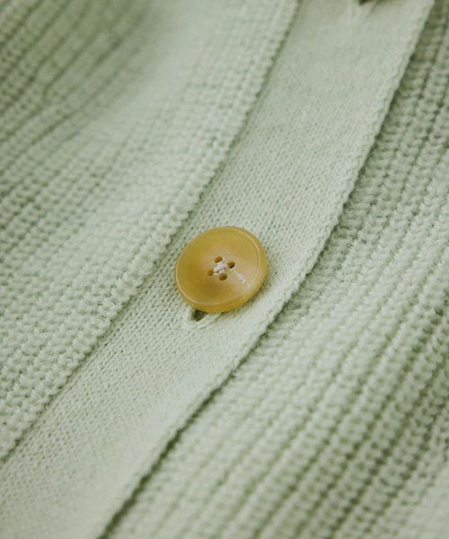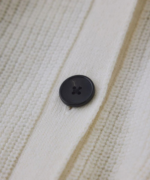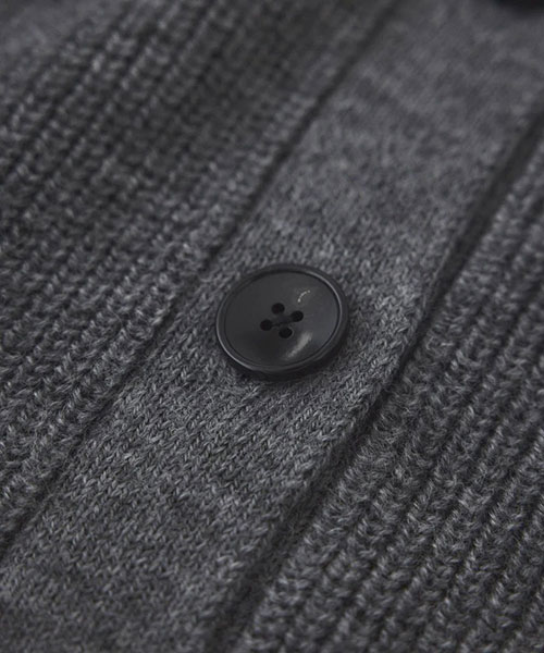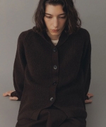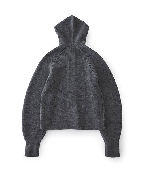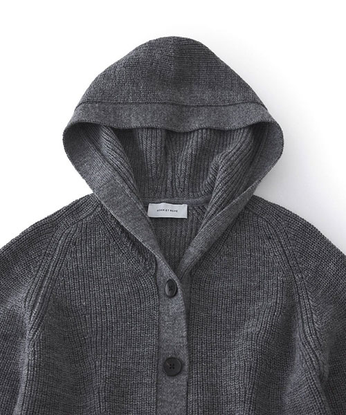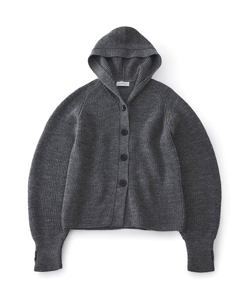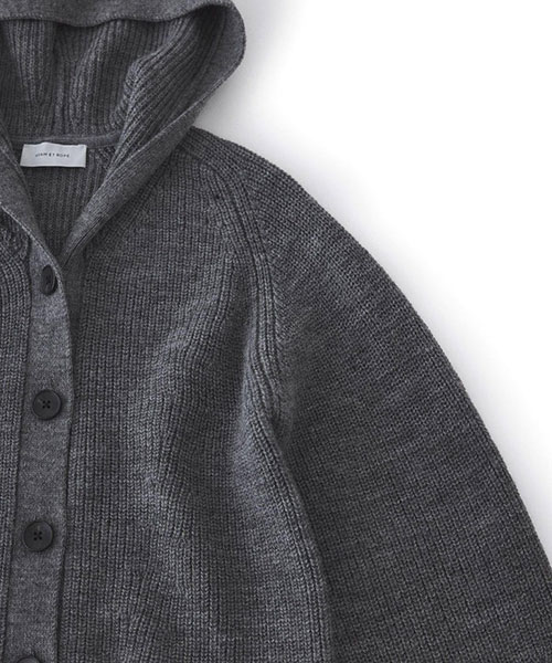 ざっくりとした片畦編みで編み立てたボタンタイプのニットフーディー。