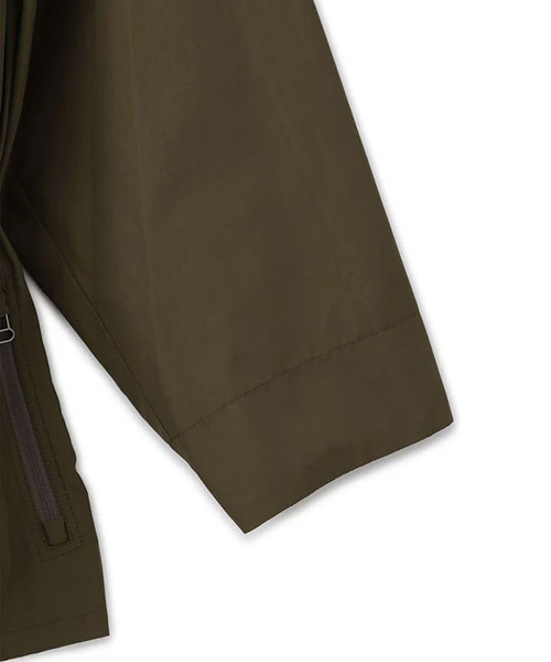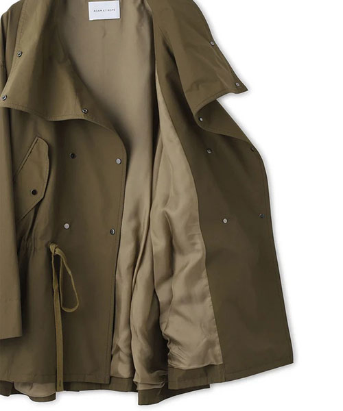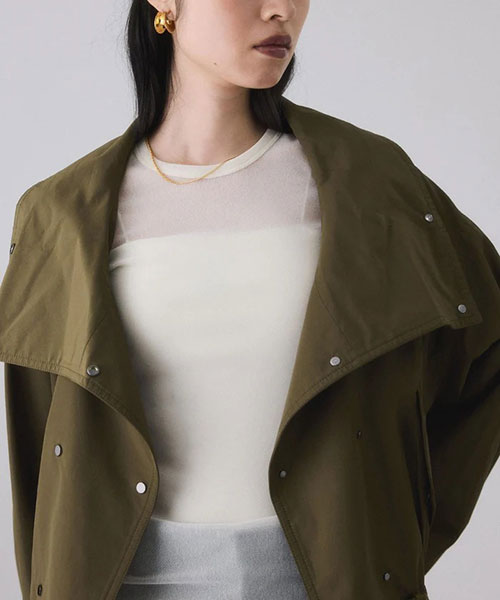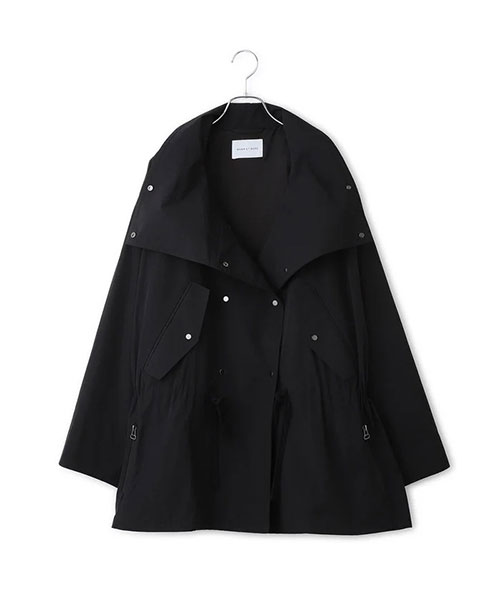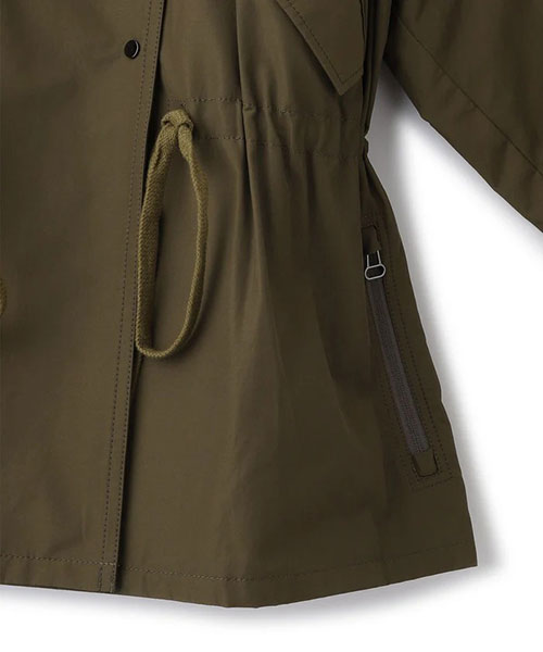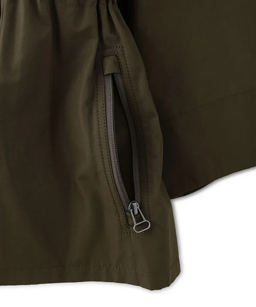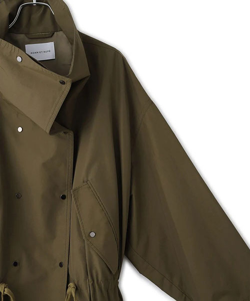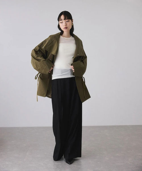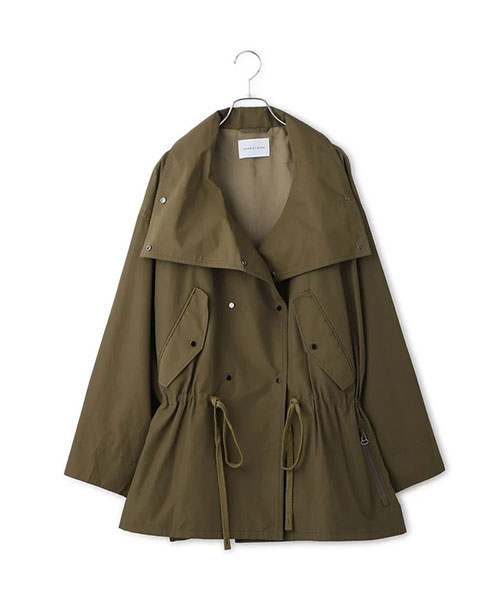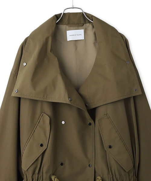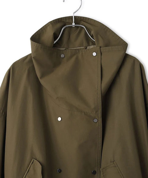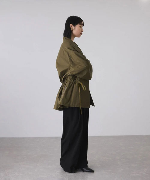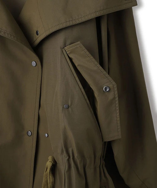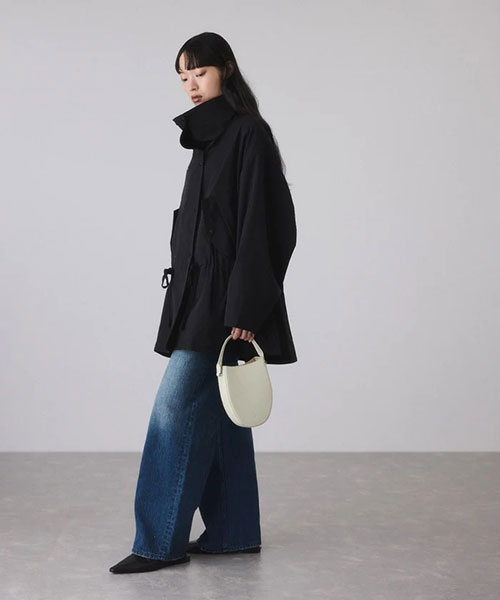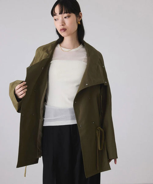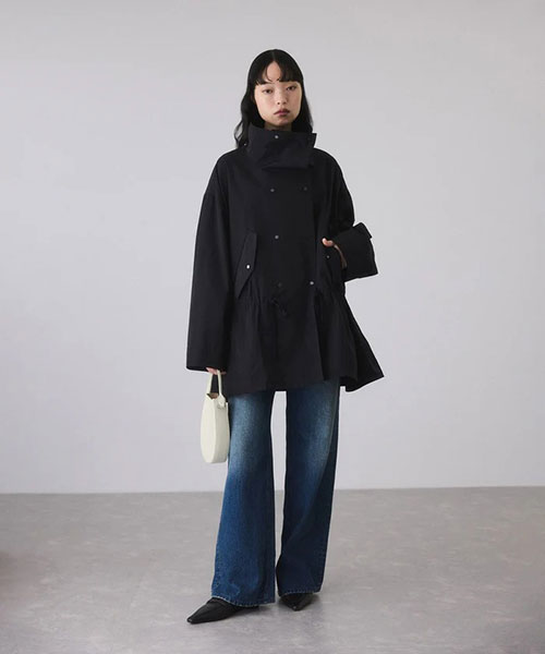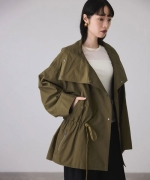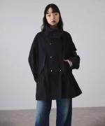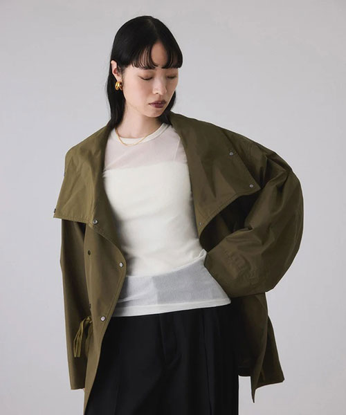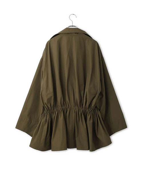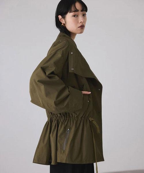 フロントのドットボタン開きやZIPファスナーポケットなどアクティブな印象と、たっぷりの分量を纏った女性らしいシルエットの1着。