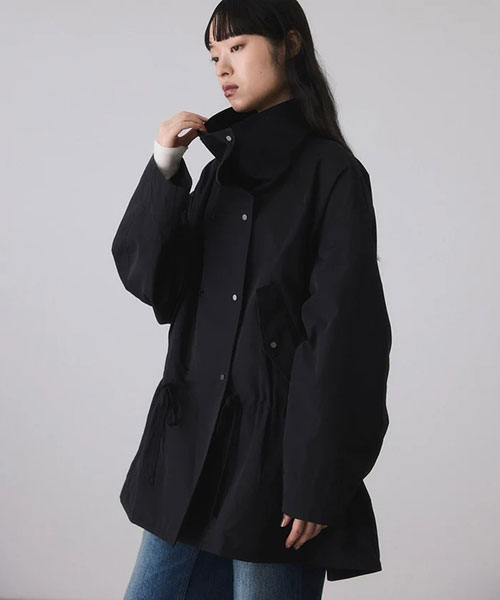 大きめのスタンドカラーがマニッシュなムードを演出。ドロストデザインで女性らしさと共に、簡単に大人のカジュアルスタイルを取り入れられるミドル丈ブルゾン◆2025-26秋冬◆