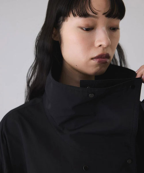 通常より大きく下がった前下がりから付けた高めなスタンドカラーがポイント。