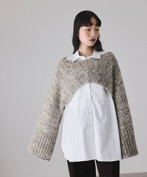 またボタンを留めずに斜めにずらして着用すると、ポンチョとして遊び心ある着こなしも。