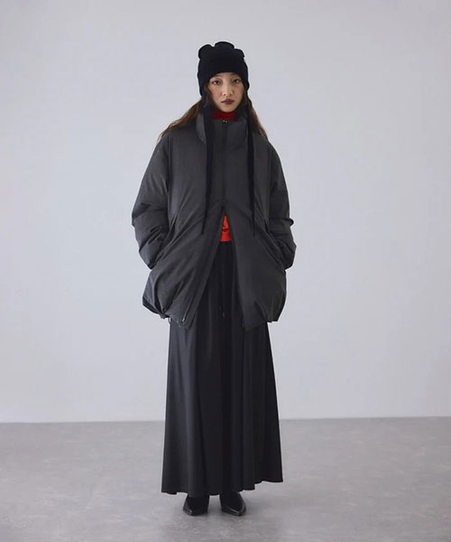 素材感を活かしミニマルなデザインを採用したミドル丈のダウンコート。