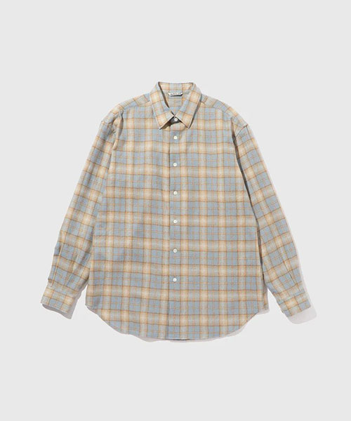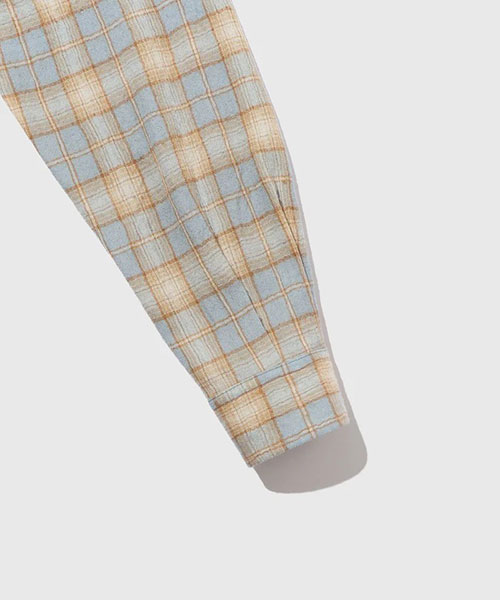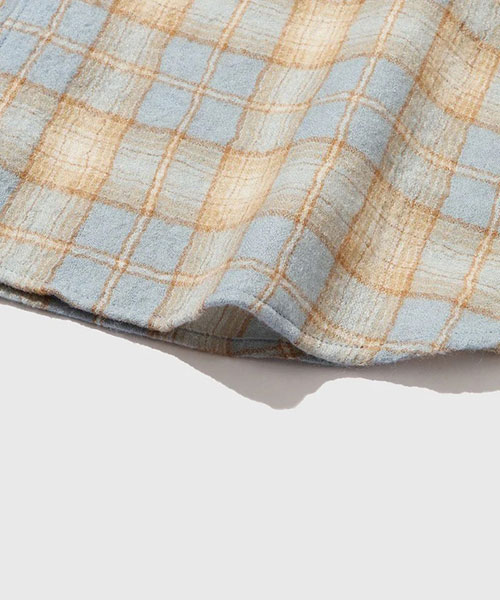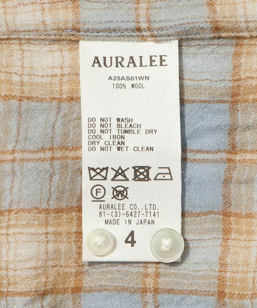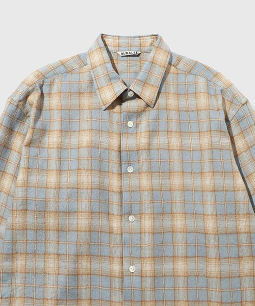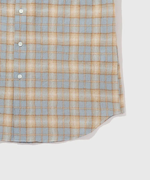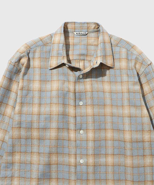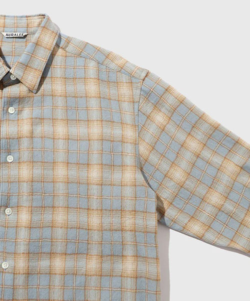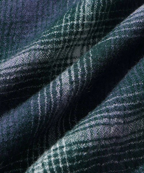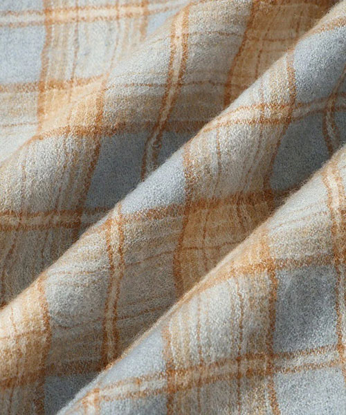 極細の梳毛ウールを特殊な手法で柔らかく撚った糸を使用し、ふんわりとした質感に仕上げた素材です。この素材は、織り上げた後に洗いざらしたような自然な風合いを最大限に引き出す加工を施しており、軽やかで快適な着心地を実現しています。さらに、洗練された色彩のチェック柄が特徴のウール100%素材です。