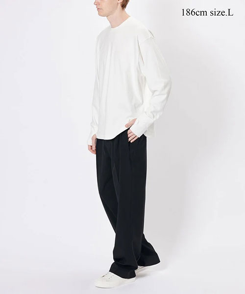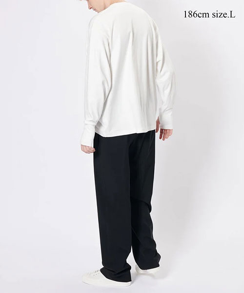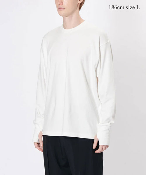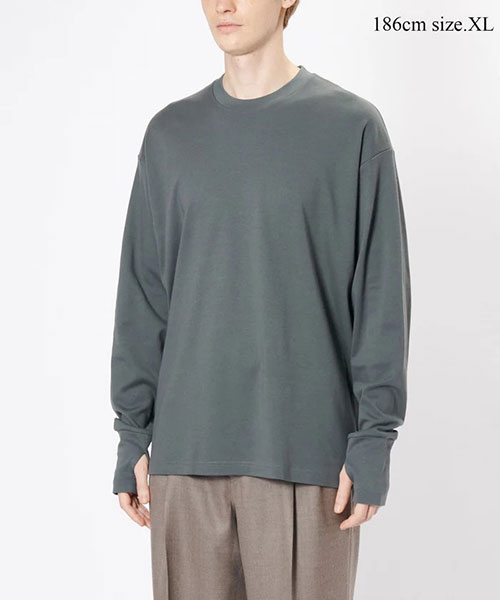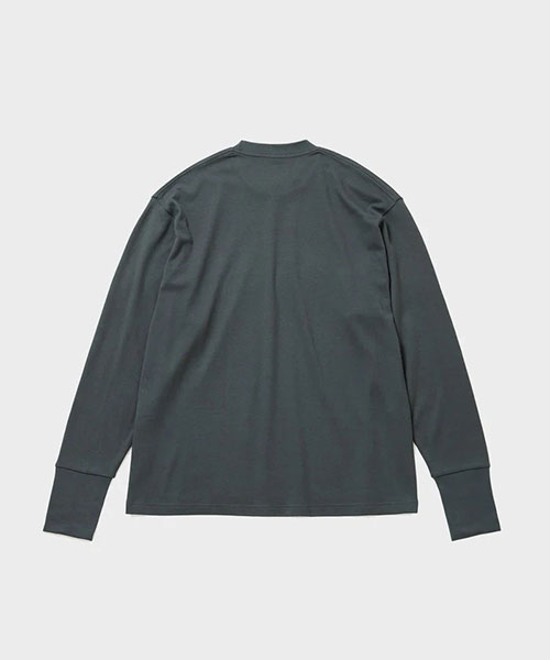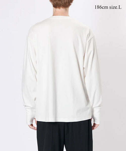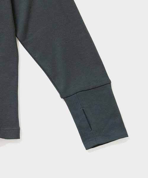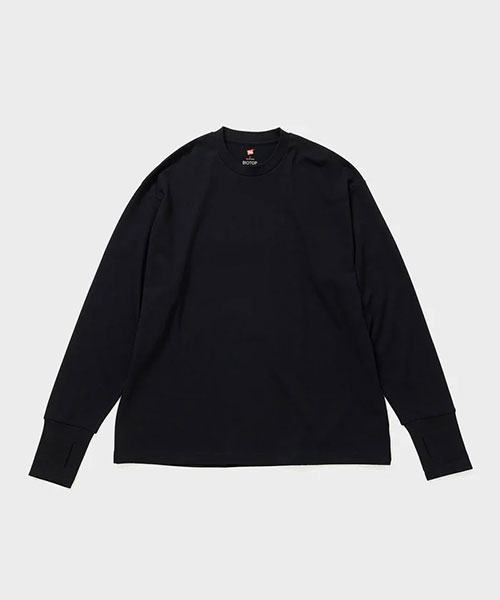 デザイン性と機能性を両立した袖口のサムホール(指抜き)仕様やシャープに決まるネックライン、リラックス感溢れるドロップショルダー、着た時のバランスを考慮し前身頃よりも後ろ身頃をやや長く設定した着丈等々、随所にBIOTOPらしいディテールを落とし込みました。