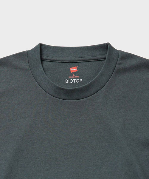 ネック裏部分はHanesとBIOTOPのダブルネーム仕様でさりげない特別感を演出。