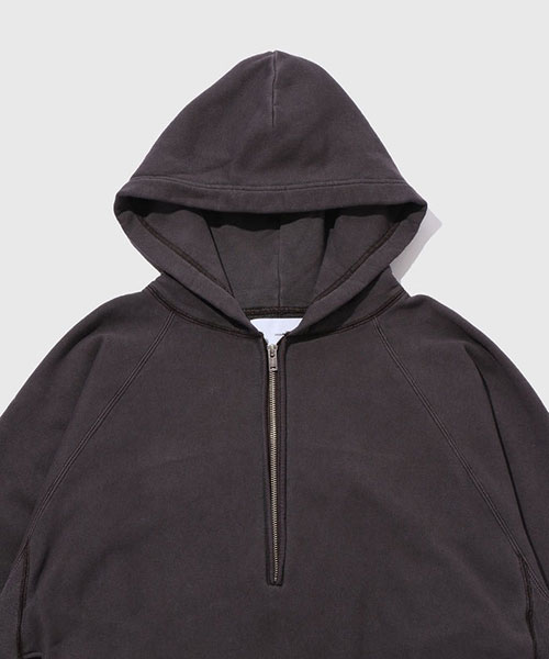オリジナルジップを採用したハーフジップタイプのフーディー。フロントには両サイドにポケットを配し、実用性も兼ね備えています。