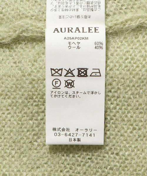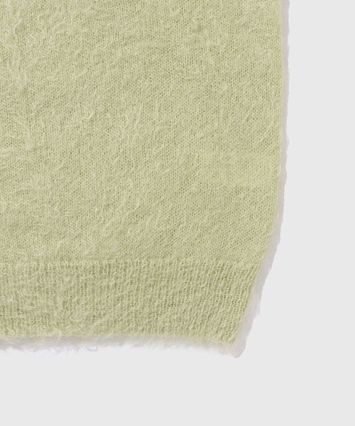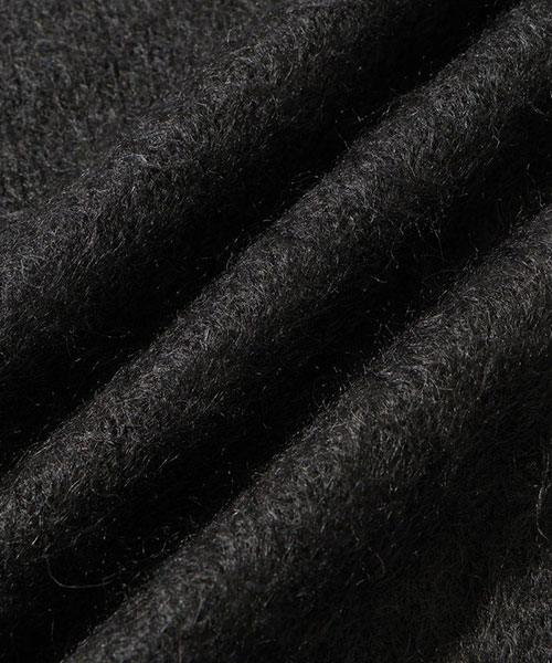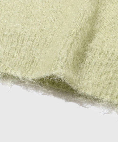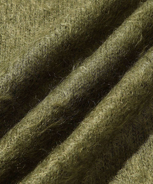 南アフリカ産の柔らかなスーパーキッドモヘヤを甘撚りに紡績し、芯糸には柔らかな天然ウールを使用して編み上げた、ふんわりとした温かみを感じる極上のモヘヤニットです。軽やかで滑らかな肌触りに加え、モヘヤ特有の美しい光沢感と、ボリューム感のある長い毛足が特徴です。